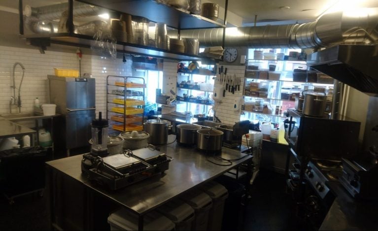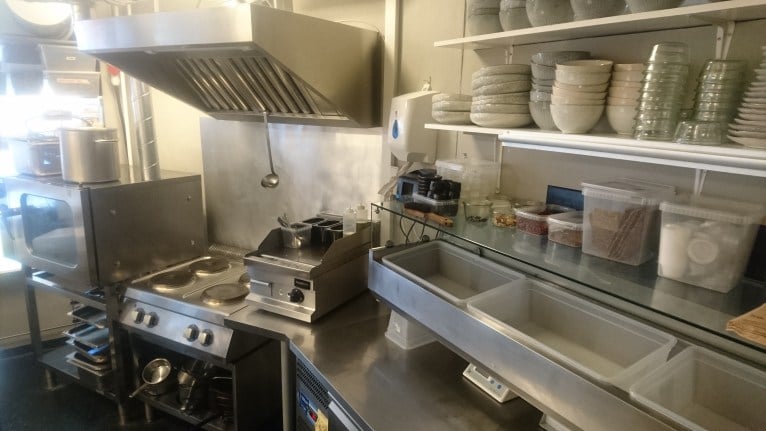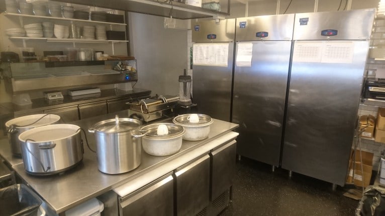 Fuld køkken er tilstede og kan nemt betjene en stor restaurant hvis det er mere i den dur der ønskes at iværksætte. Idag drives Caféen med et koncept centreret om helse, med grønne drinks, øko råvarer og kvalitets mad. Også egnet til traditionel bar.