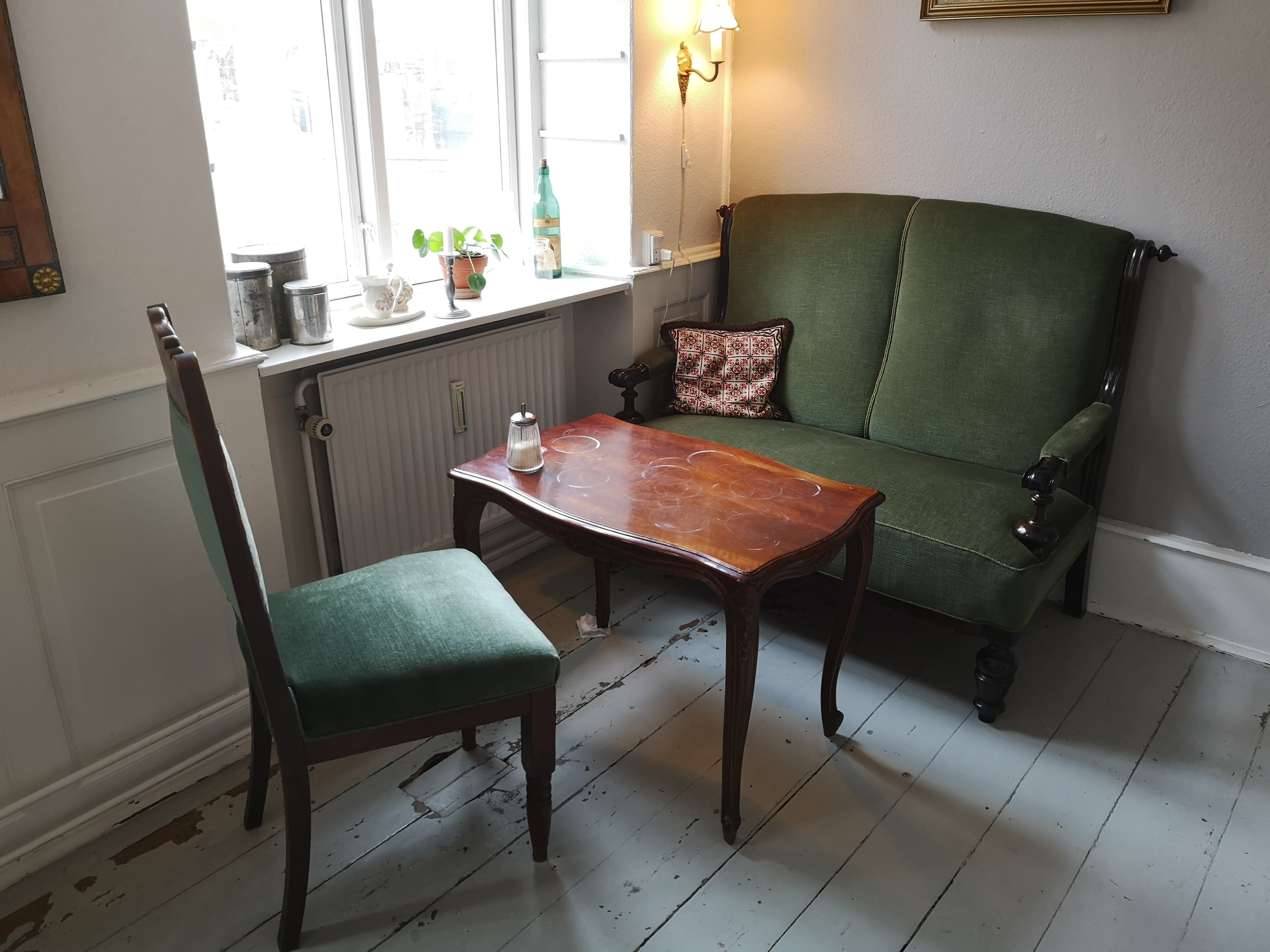 Cafeen er hyggelig med gamle "mormor" møbler og plads til både voksne og børn.