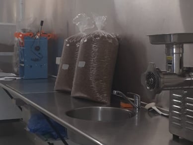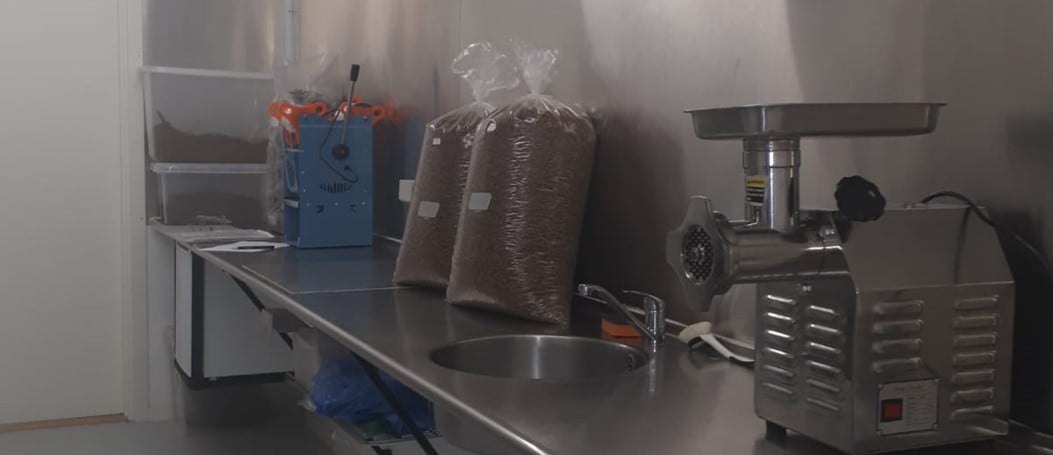 I en anden hal bruger vi ca. 150m2 til vores industrikøkken, som består af et rum til tørring af melormene og et rum til forarbejdning og emballering. Her har vi også en lager container til alle færdigprodukter, et fryserum til at lave frosne melorme og andre produkter af melorme, som skal være på frost. F. eks. Heimdal Bøffen. Vi har pakkeborde og pakkeafhentning.