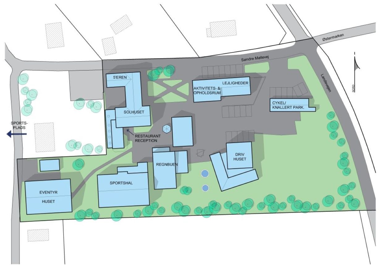 Oasen Samsø Feriecenter ligger på en stor park lignende grund, der er fodboldbane og op mod 3000 kvm bygninger.
