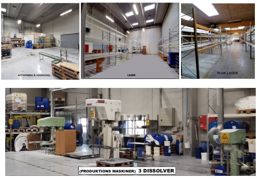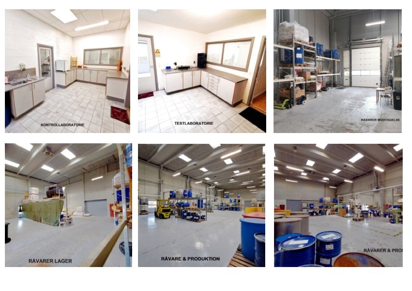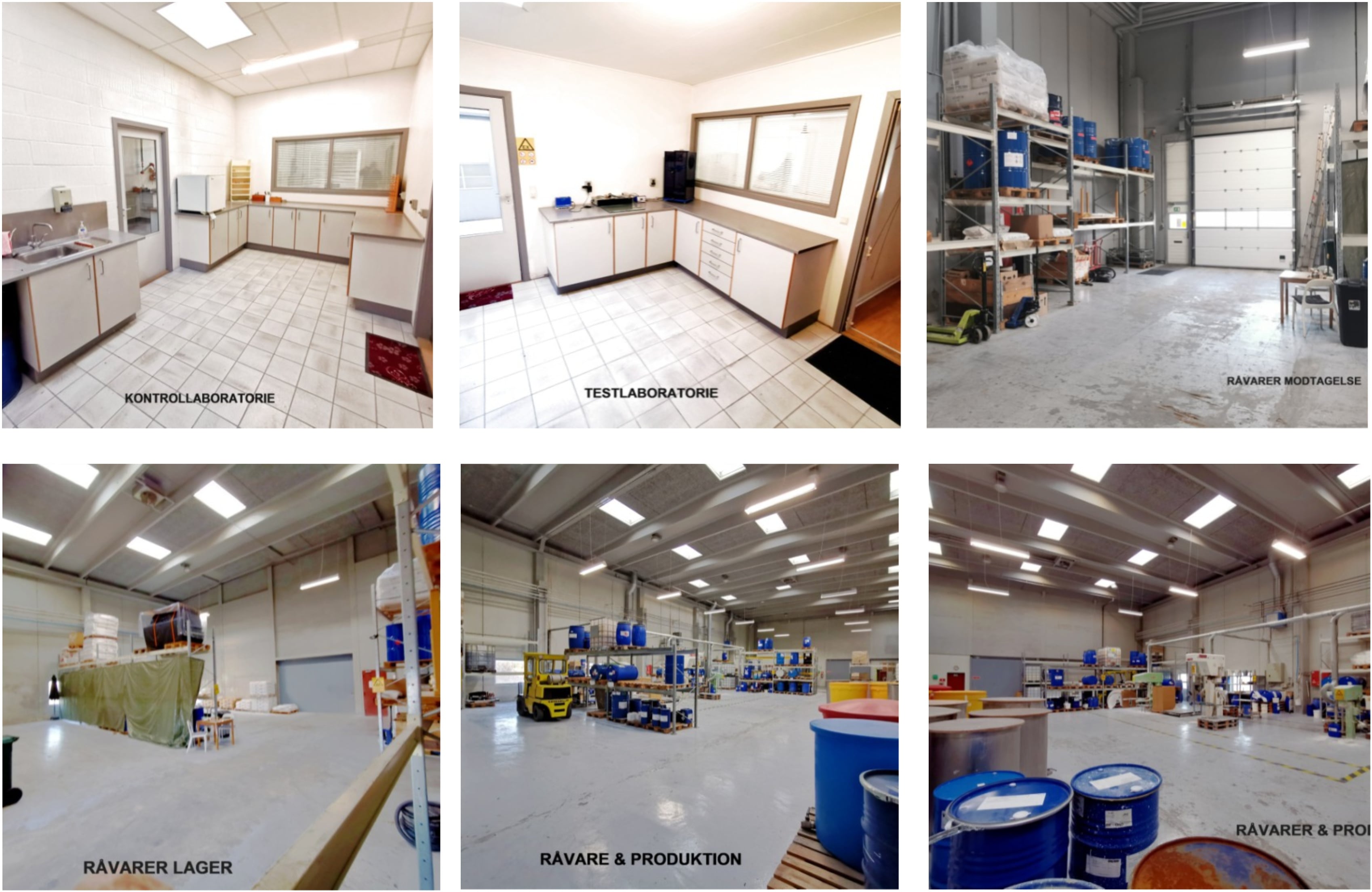 Fabrikken består af Møderum - 2 kontorer - lille kantine - Toiletter og bade rum - 1 rum med test af kvalitet - 1 rum med test under fremstillingen - 1 udviklingslaboratorium - et stort råvarer lager - en stor produktionshal - et stort lager - et lager til mindre spande varer - samt et emballagelager.