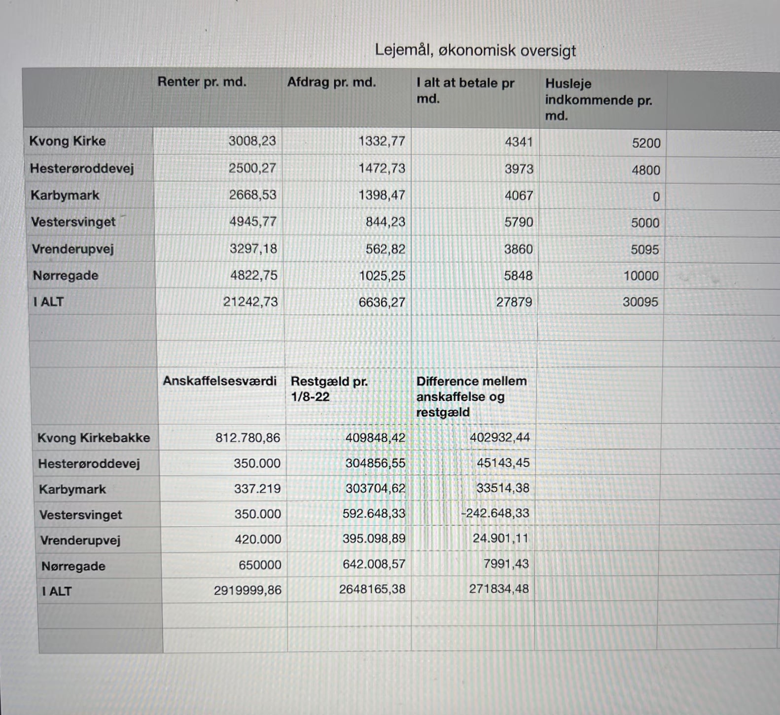 Lånene pr md udgør ca 27.000 kr. for alle lejemål. Dvs et plus når alt er lejet ud på ca 9.595 kr.