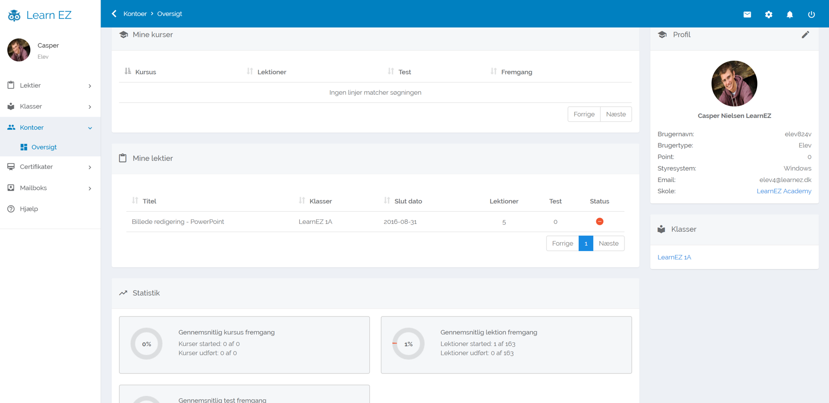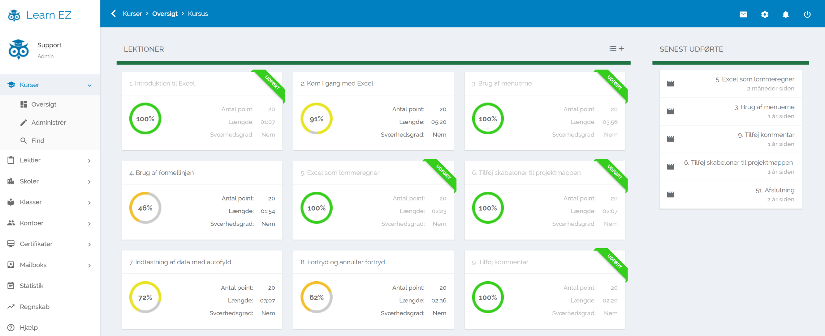 - Badge & Point system for hvert lektion/opgave der udføres, opnås et point. Kan tilpasses for hvert lektion og kursus.