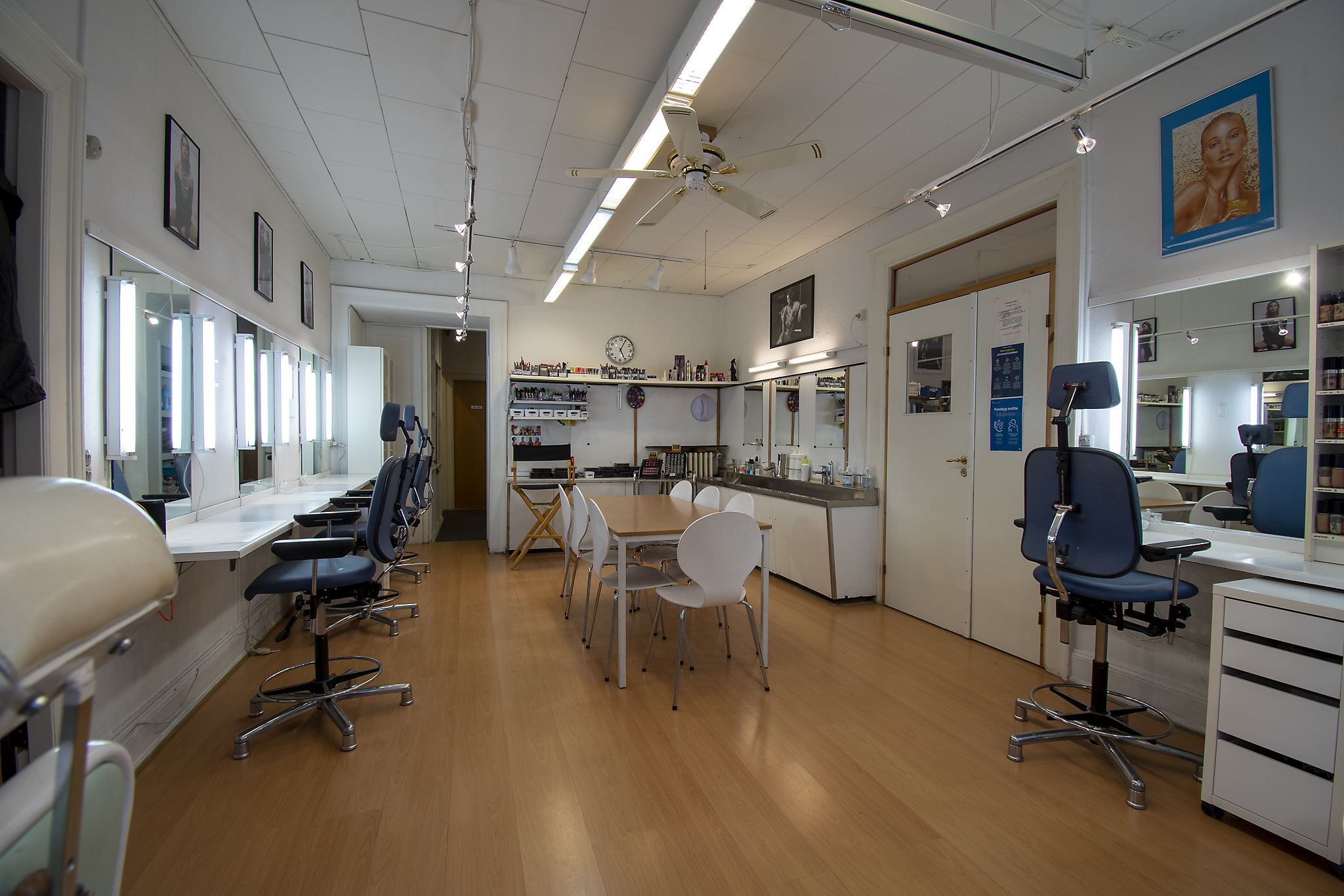 12 sminkepladser bestående af stol med ben- & nakkestøtte. Spejl og belysning samt fralægningsborde.