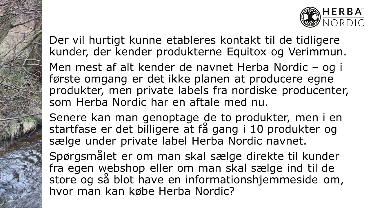 Men ved en genstart af virksomheden - der jo har logo, flyers og anden markedsføring som Facebook og Instagram - vil private label produkter i Herba Nordics navn være lige til at gå til. Aftaler findes allerede.