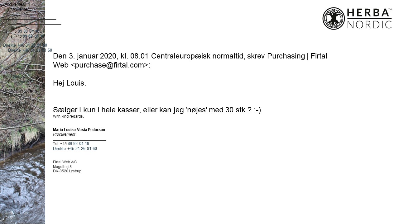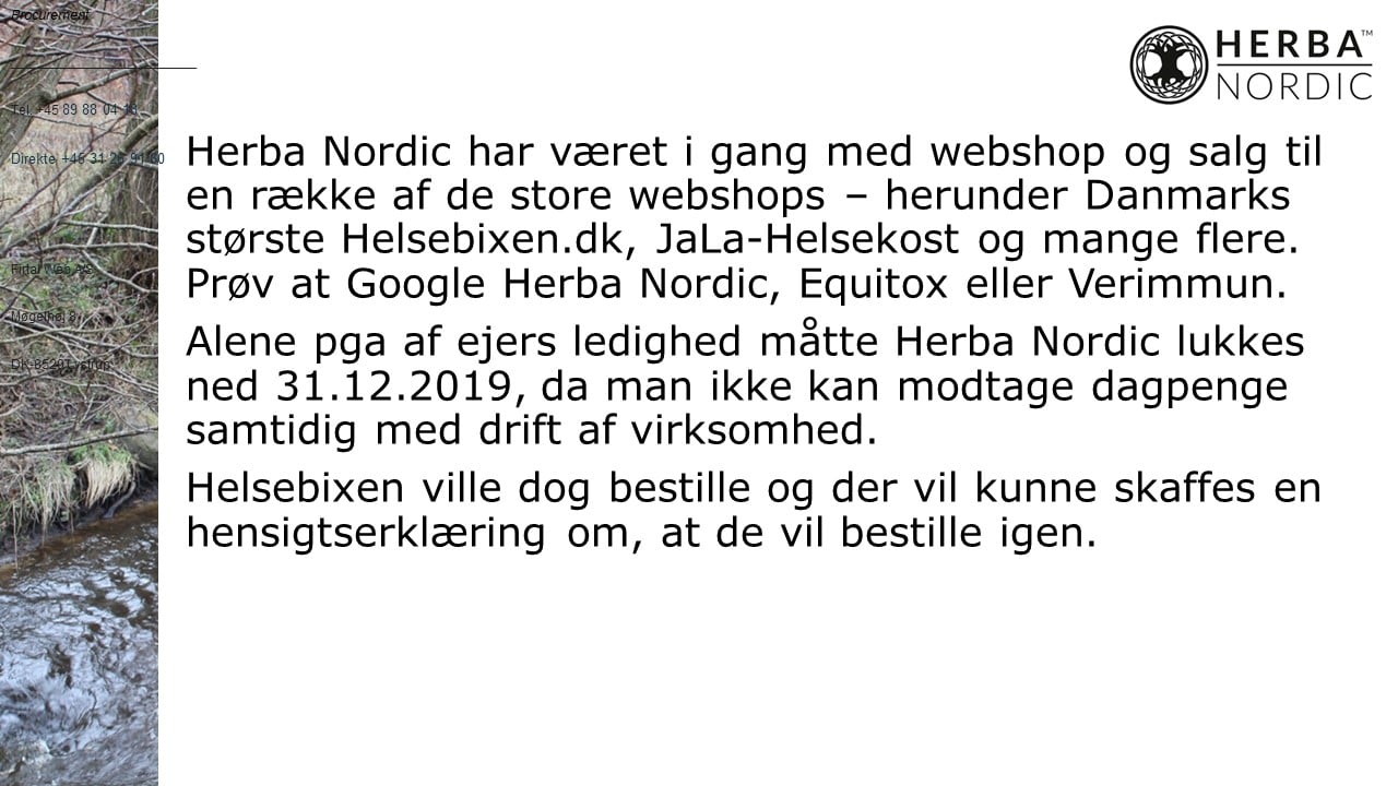 Herba Nordic blev pga. ejers arbejdsløshed lukket ned 31.12.2019. Der var begyndt at komme gensalg, men ikke nok til at finansiere en løn. Herba Nordic kan dog hurtigt startes op og blive klar til eksekvering, men ejer er bedst på produktsiden og SEO-tekster (journalist/cand.mag.) og ikke på den del, der vedrører internetsalg.
