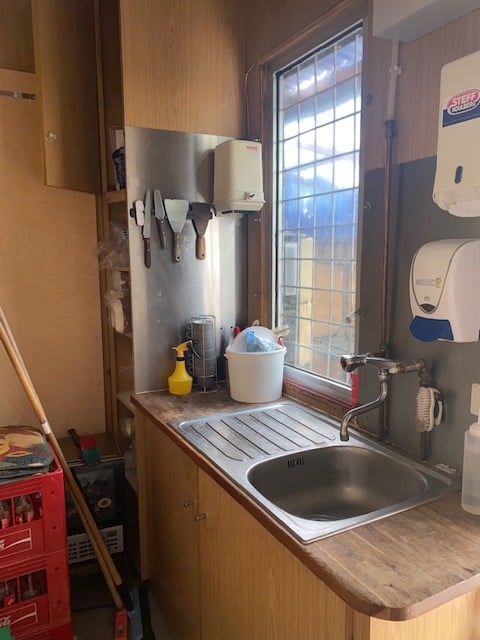 Fra ejendommens bagindgang kommer man ind i et fint anretterkøkken med en vask og god plads til opbevaring, så man kan forberede, hvad man har brug for.
