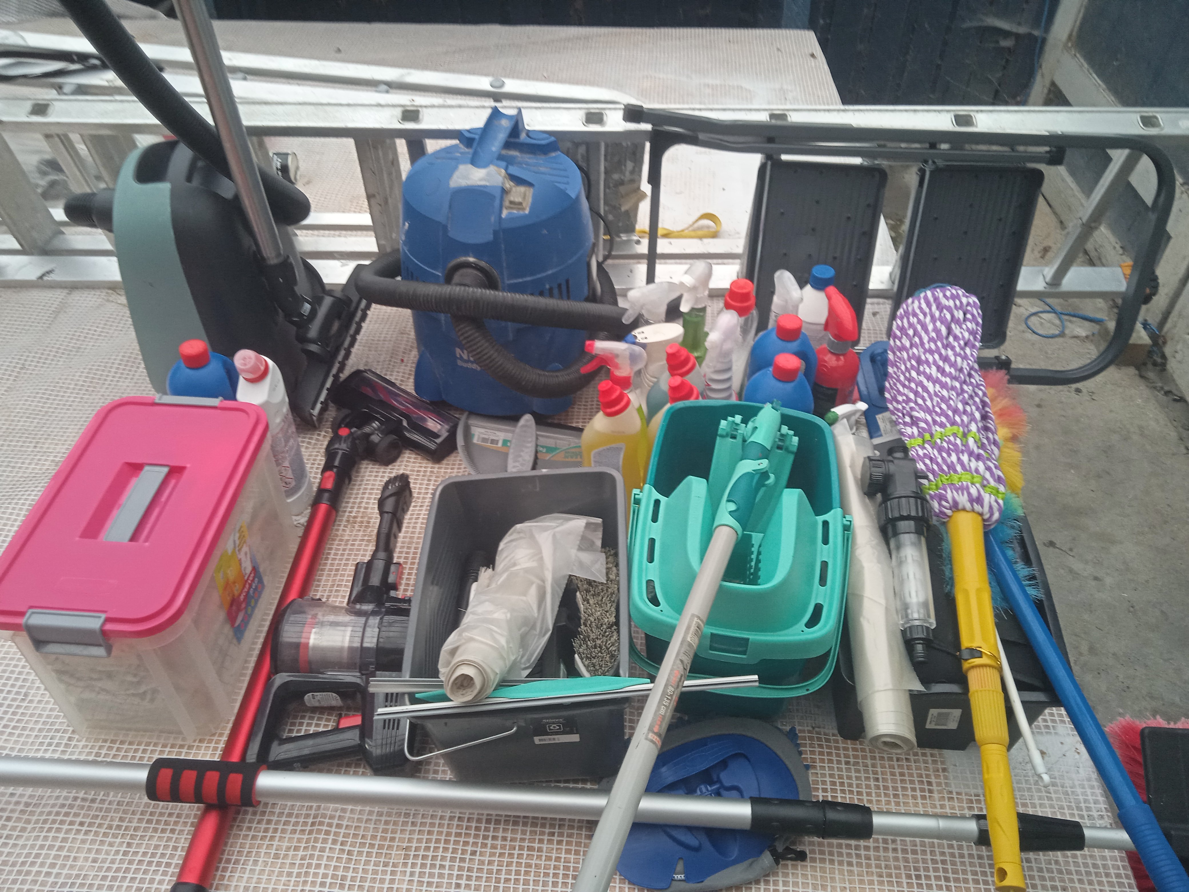 Rengøringsudstyr, arbejdstøj, rengøringsartikler.