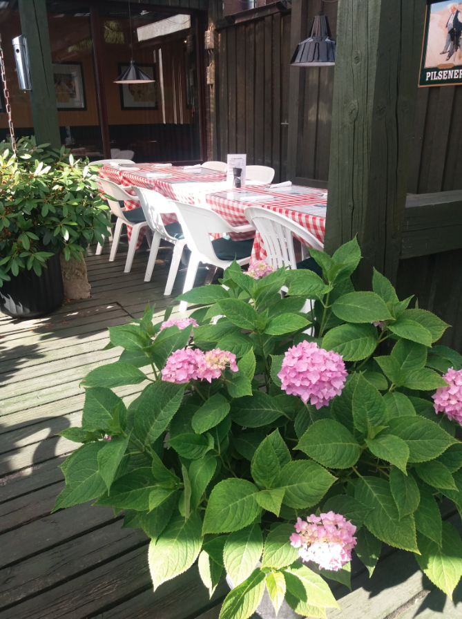 Om sommeren har vi en fantastisk gaardhave som er særdeles velbesøgt på grund af nuværendes ejers helbred har forretningen kun åbent om aftenen 6 dage om ugen. Før havde vi åbent til frokost også og 7 dage om ugen , der var omsætningen 1.2 million højere end nu.