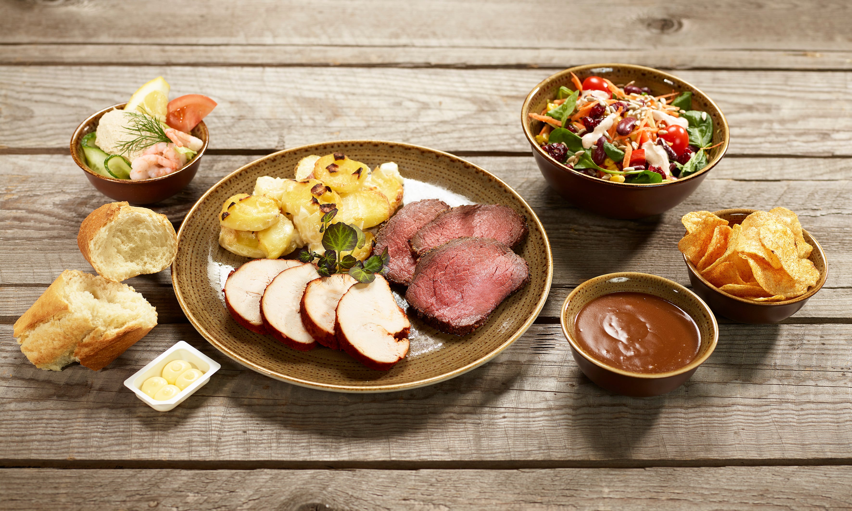 Steakhouse retter så som: Rosastegte Stege, Helstegte Kalkun stege, Originale Spareribs etc