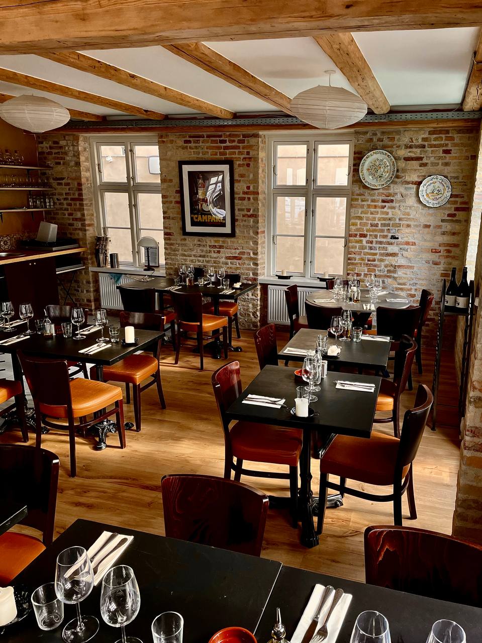 Frithængende bjælker og rå murstensvægge giver en fantastisk atmosfære og hyggelig stemning.