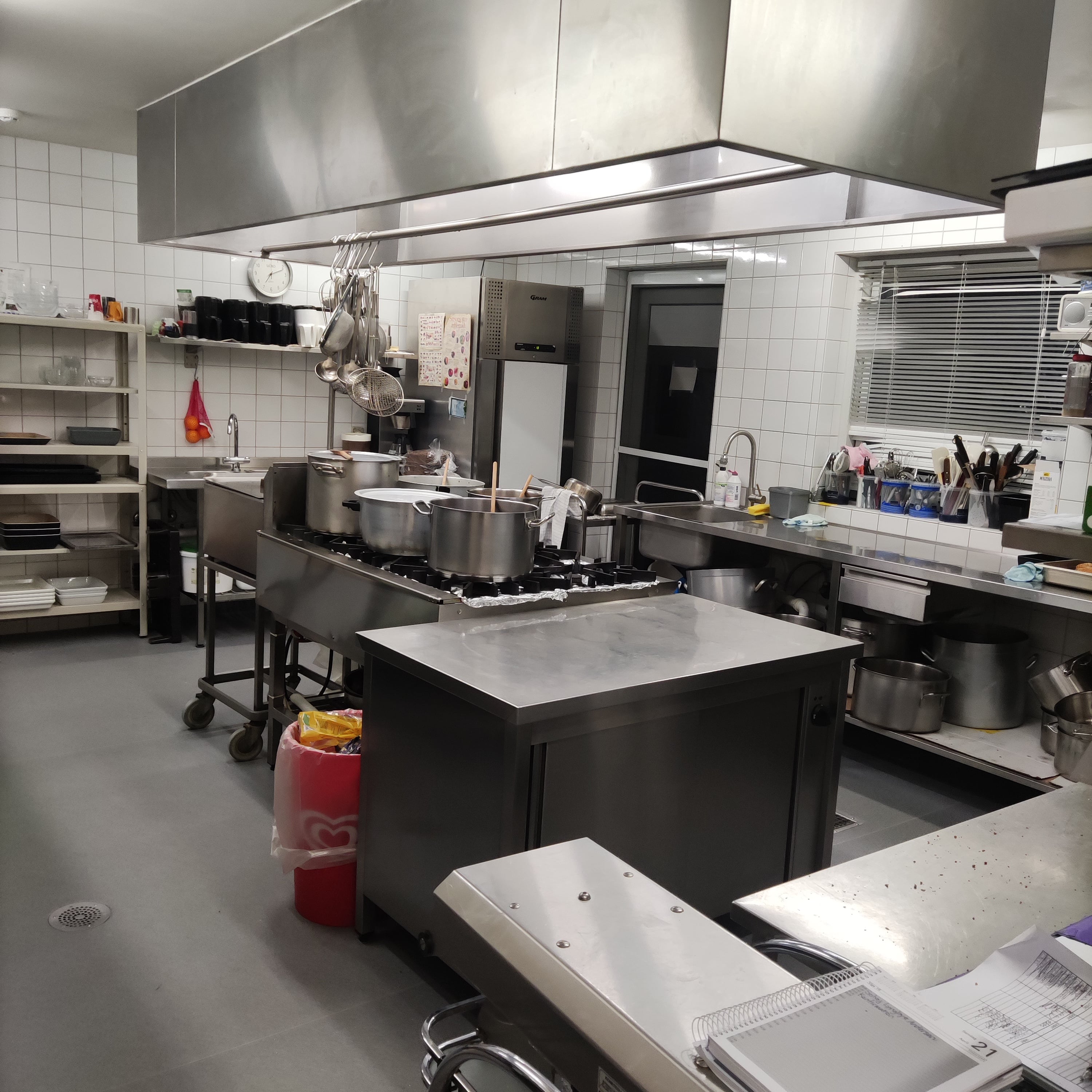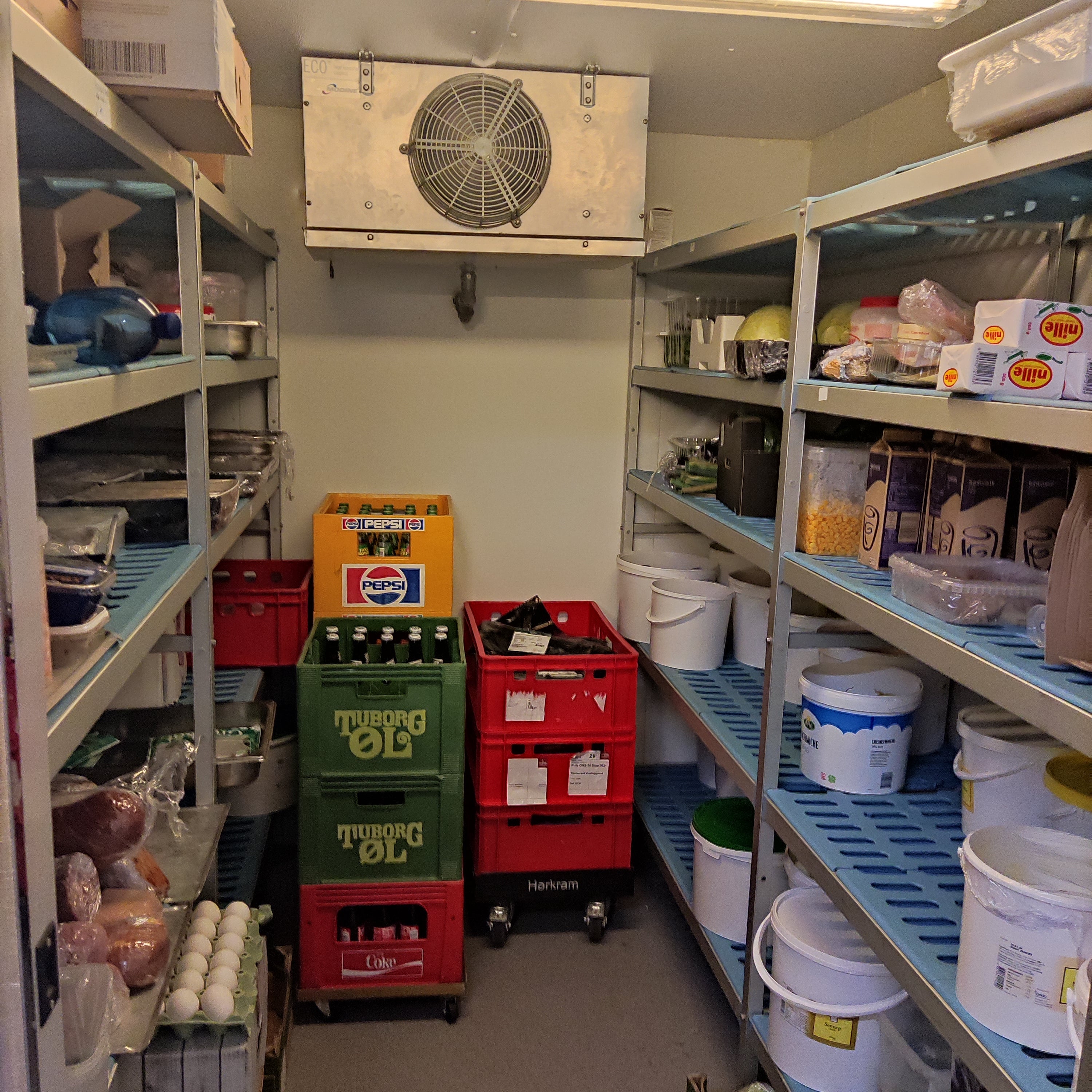 Stort køkken med kølerum, komfur, ovn og masser af værktøj.