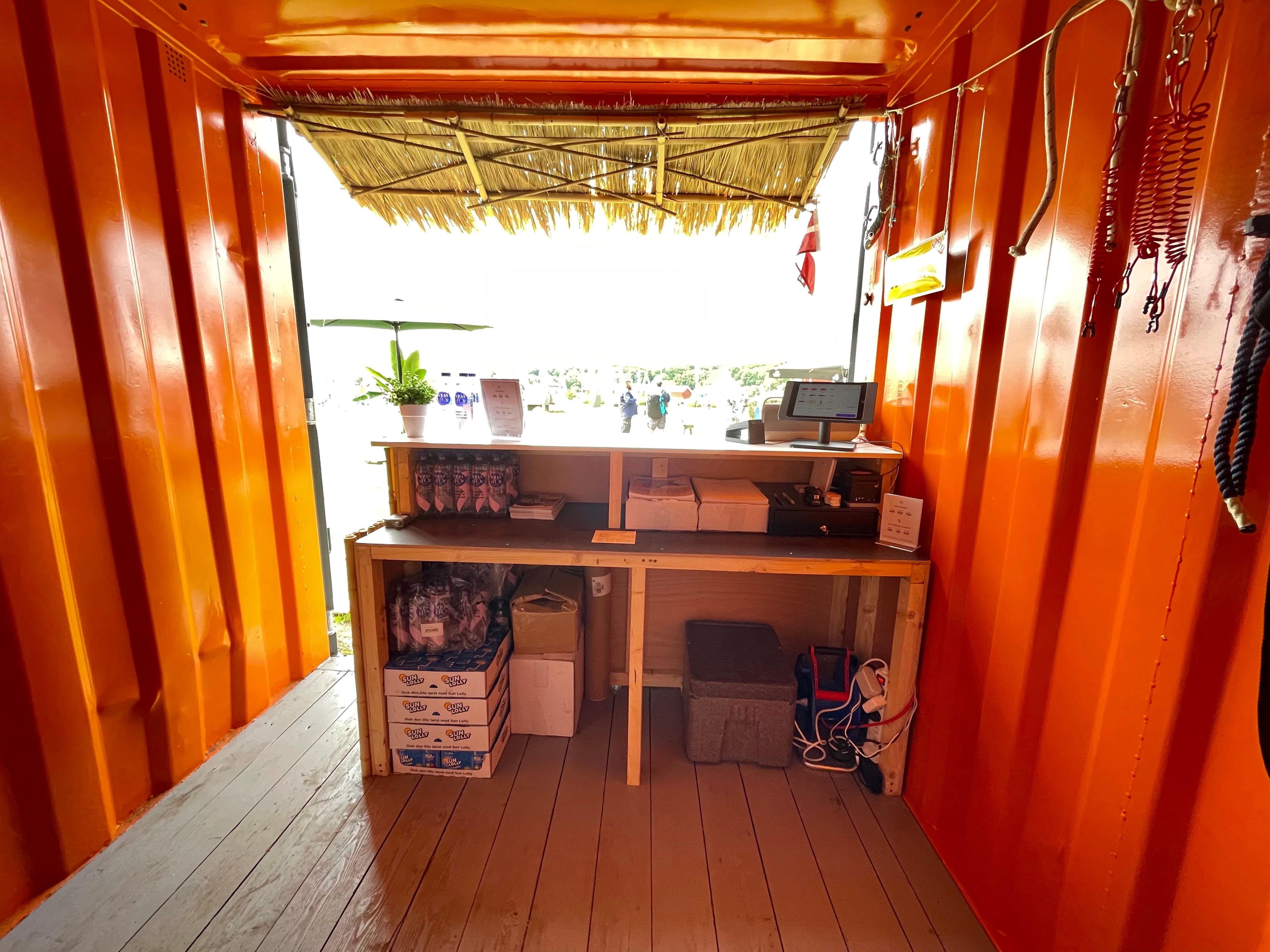 •1 stk. 8 fods butikscontainer i konceptfarver m: •Indbygget desk I bambus