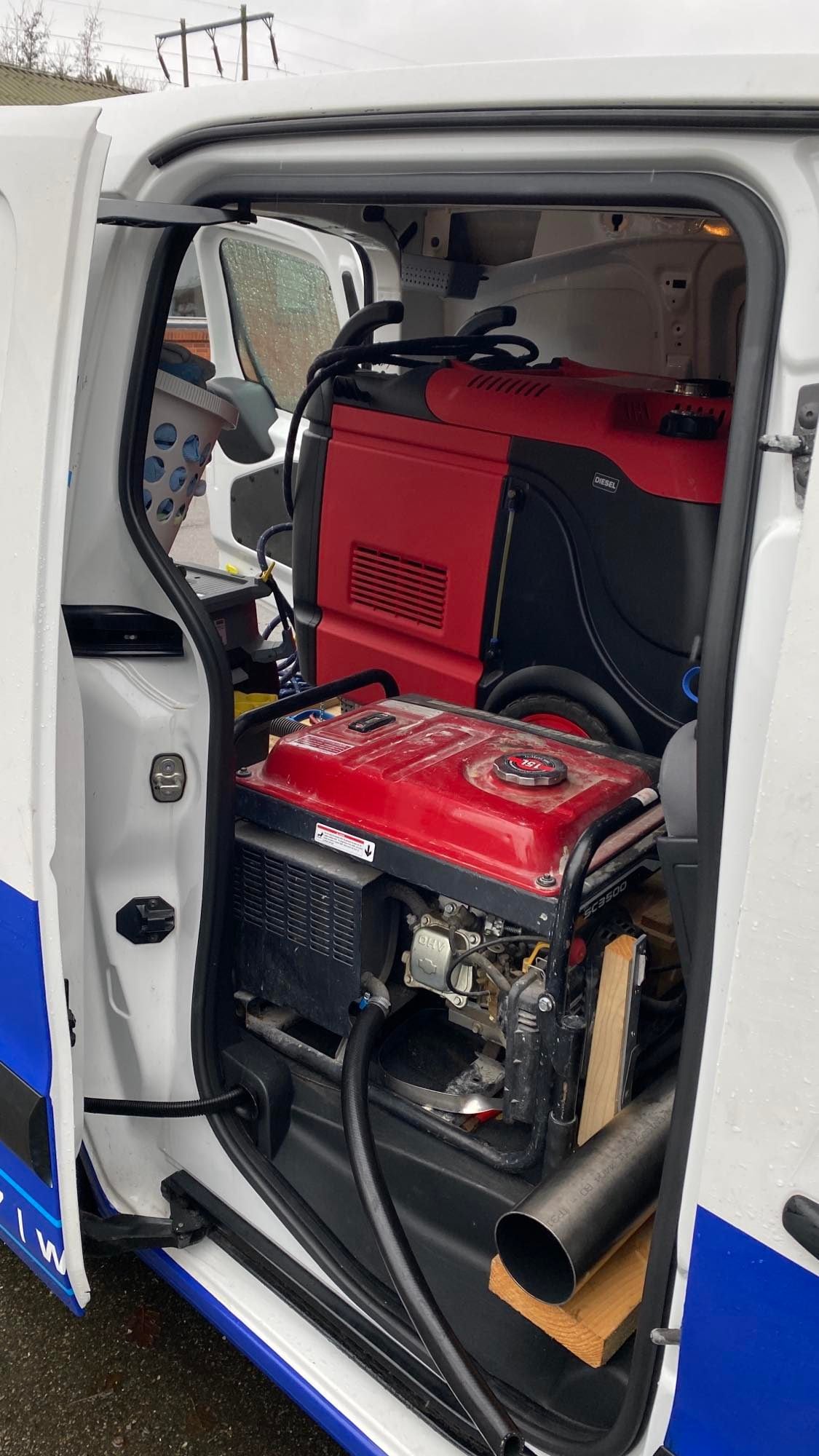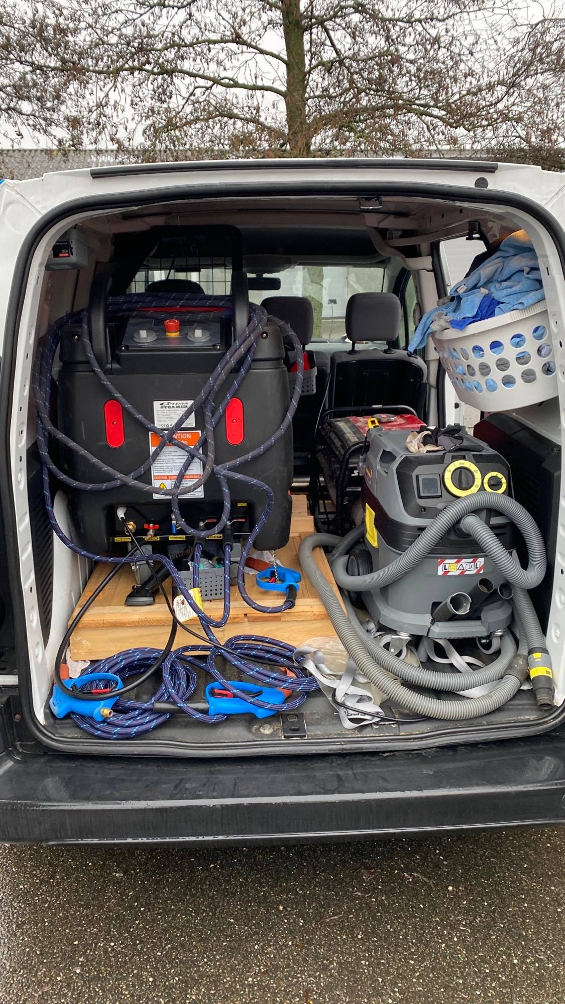 Da rengøringen af bilen foregår med steamer, bruges der kun 3-5 liter vand pr. bil (både indvendig og udvendigt) – der efterlades et perfekt resultat hvor alt er desinficeret og rent. Det er en miljøvenlig måde at rengøre biler på, og det elsker kunderne! Steameren kører på diesel (forbruget er utrolig lavt) og bilen er udstyret med en benzingenerator, men da jeg altid får lov til at låne strøm ude ved kunderne, har jeg kun brugt den 1-2 gange i alt – men muligheden er der.