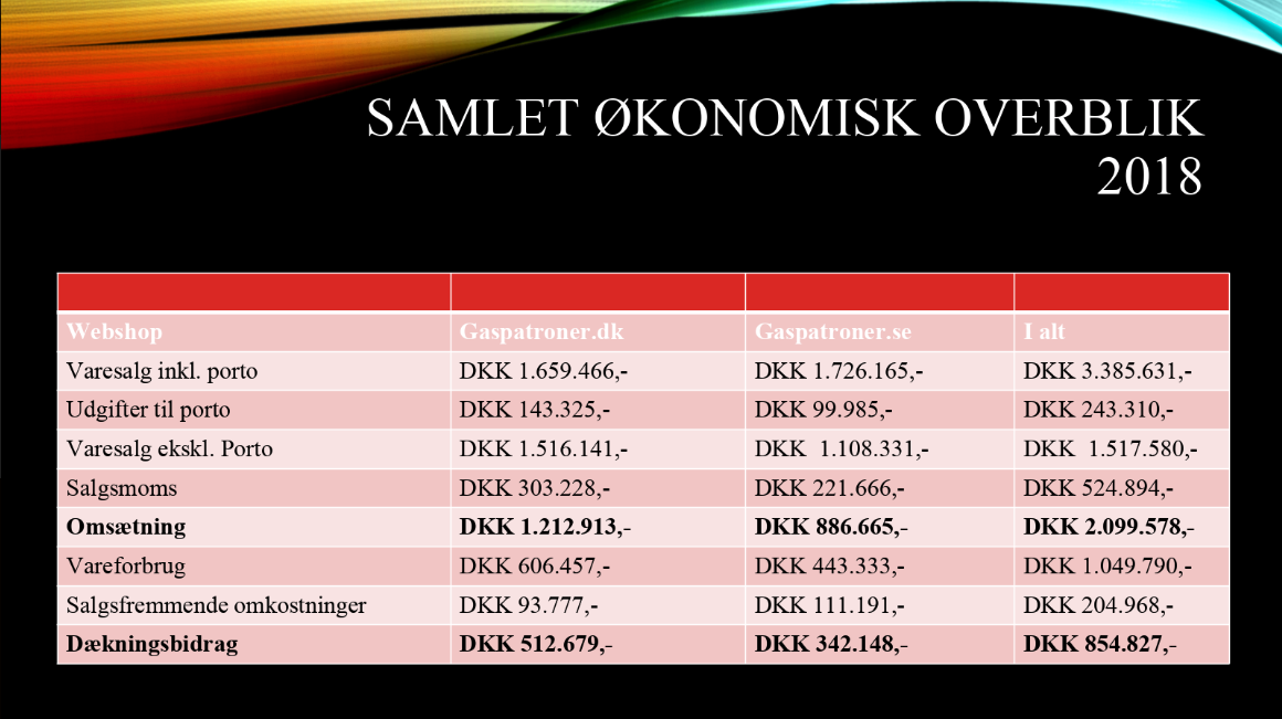 Disse tal er for Gaspatroner (dk+se) alene. Da disse shops er en del af Webshoppen ApS, forelægger der ikke separat regnskab.