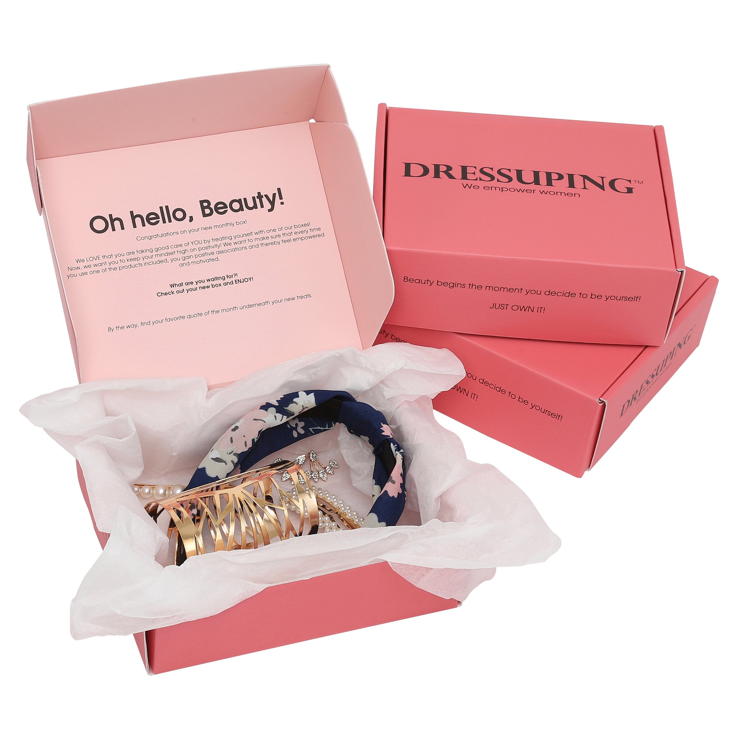 DRESSUPING er en webshop som tilbyder subscription boxes med accessories. Konceptet er tilegnet kvinder som kan lide at klæde sig pænt på og er interesseret i at modtage en box med smykker, hårpynt mv. én gang i måneden. Der er designet og udviklet en box, som hænger i forlængelse af konceptet med at give kvinder en gave én gang i måned og empower dem med smukke ting og positive quotes (se emballages oppe i billederne). Udover konceptet med subscription boxes, så er der lavet en webshop på sitet som genererer yderligere salg.