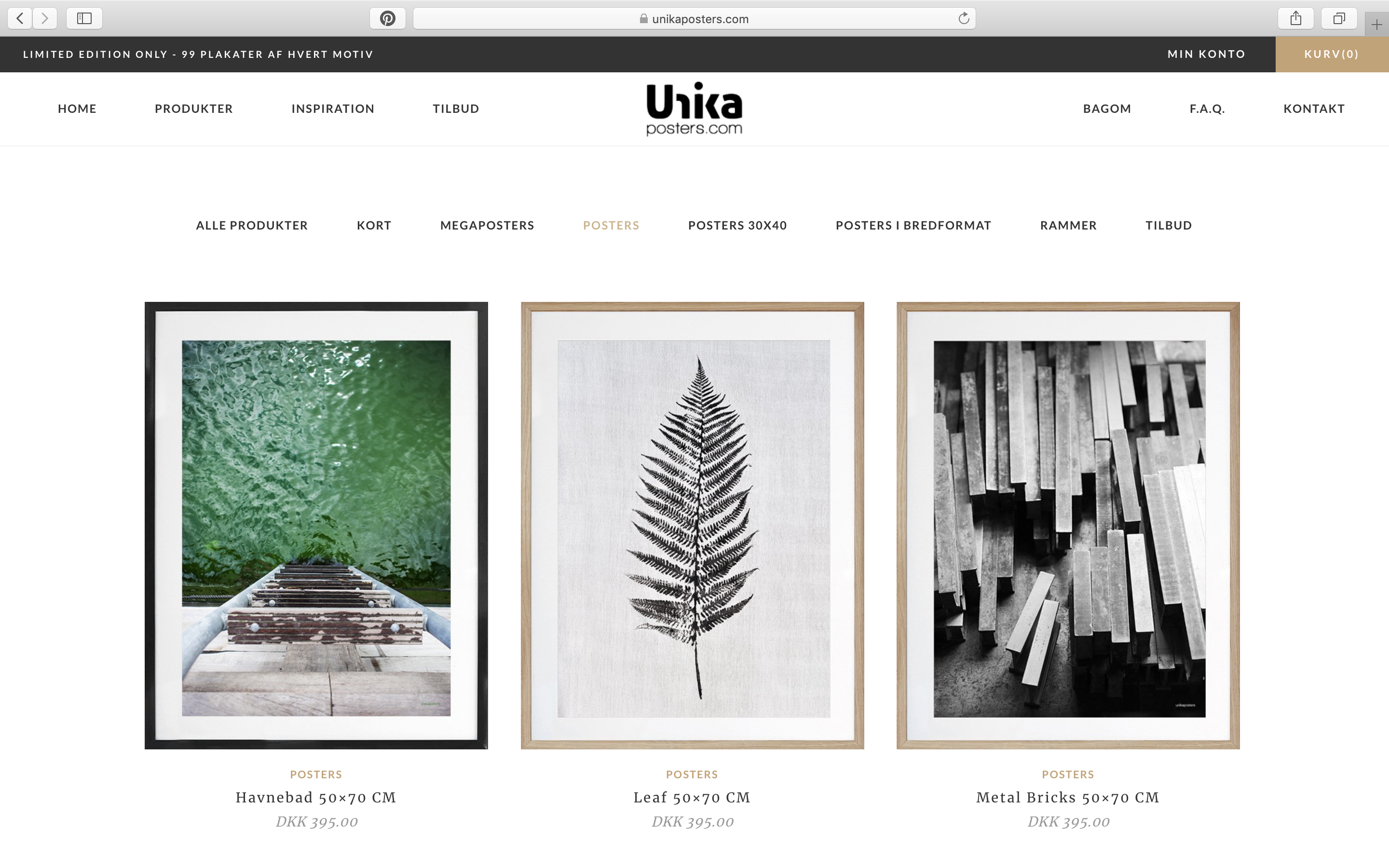 Unikaposters.com er en webshop med salg af fotokunstplakater vi selv har designet. Plakaterne sælges i 99 eksemplarer hvorefter designet udgår. Hensigten er at sikre individualitet og det unikke i hjemmet og indretningen og dermed gå udenom de masseproducerede plakater.