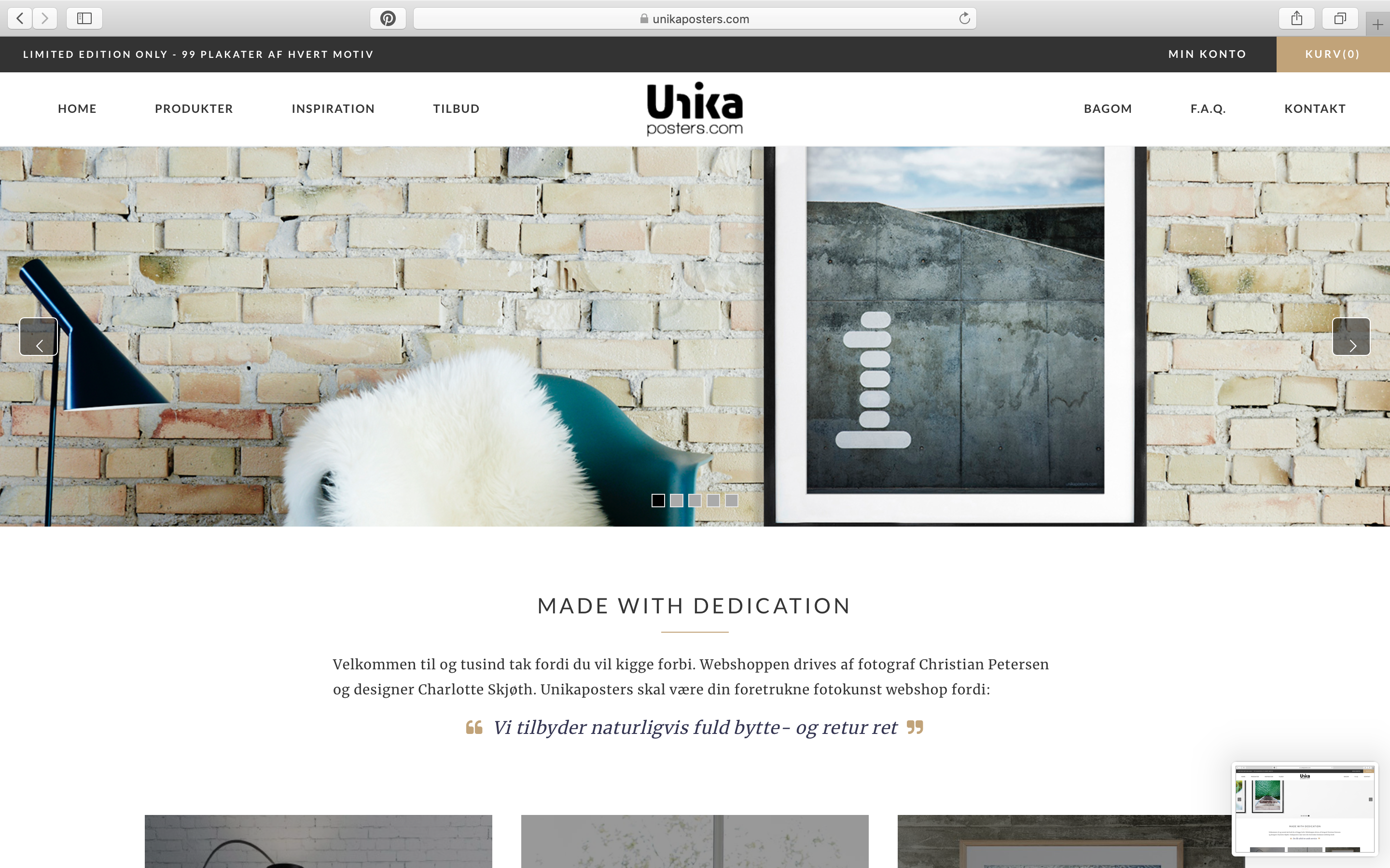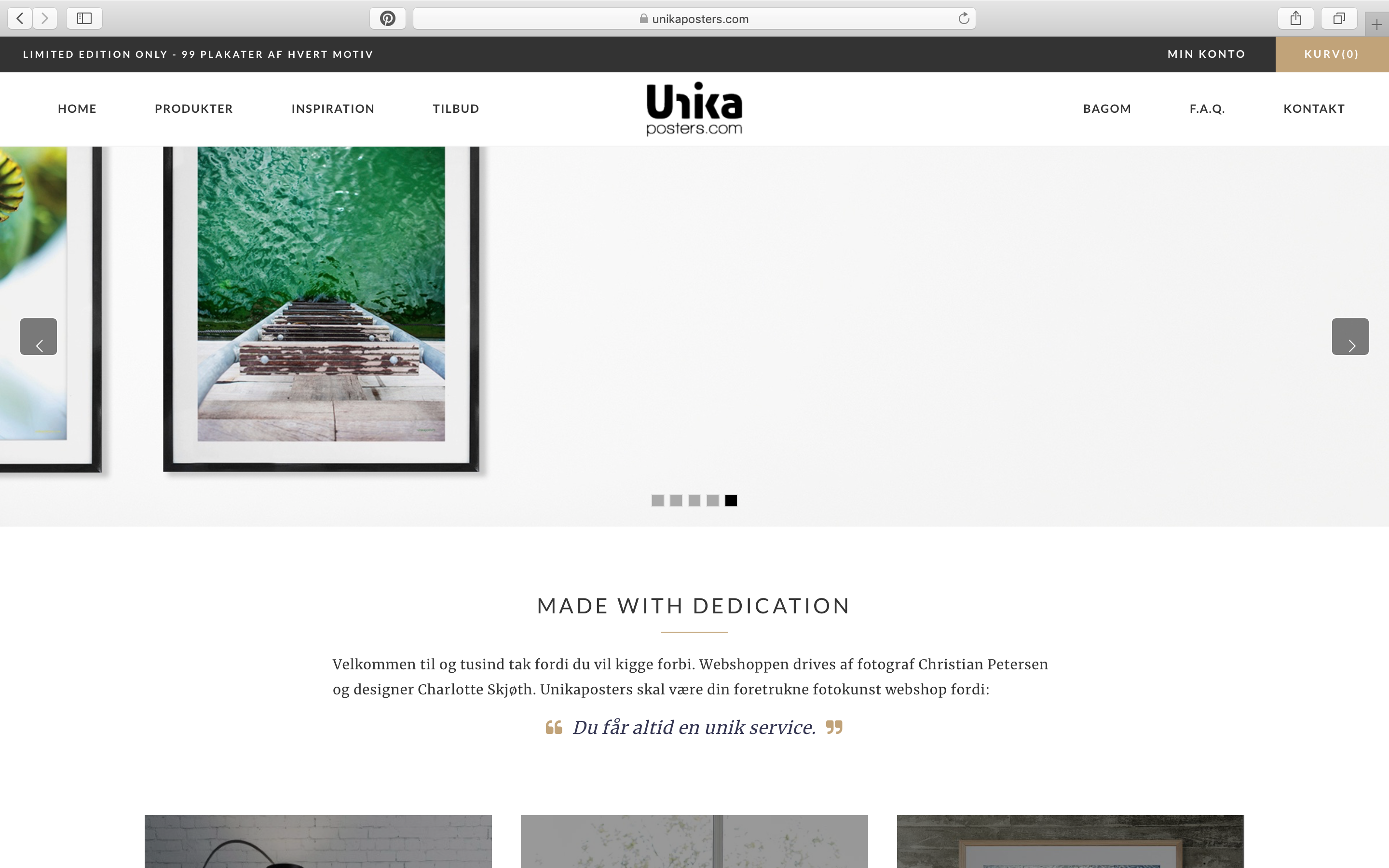 Unikaposters.com er en webshop i virkeligt smukt og brugervenligt design. Da jeg nu ønsker at afhænde min webshop, sætter jeg den til salg for en pris der ligger under det jeg har betalt for at få udviklet og designet selve platformen i Wordpress med shop i form af Woocommerce.