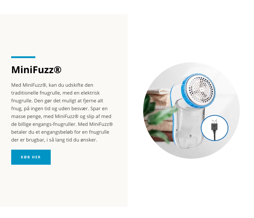 MiniFuzz er en elektrisk fnugrulle, som gør det muligt for konsumenten at udskifte den kedelige og originale fnugrulle, med en lidt sjovere elektrisk fnugrulle der er brugbar så lang tid kunden ønsker. Derudover sælges der også MiniSteamer, som er en håndholdt tøjdamper, der er kompatibel til at tage med i kufferten, så kunden kan have den med på farten.