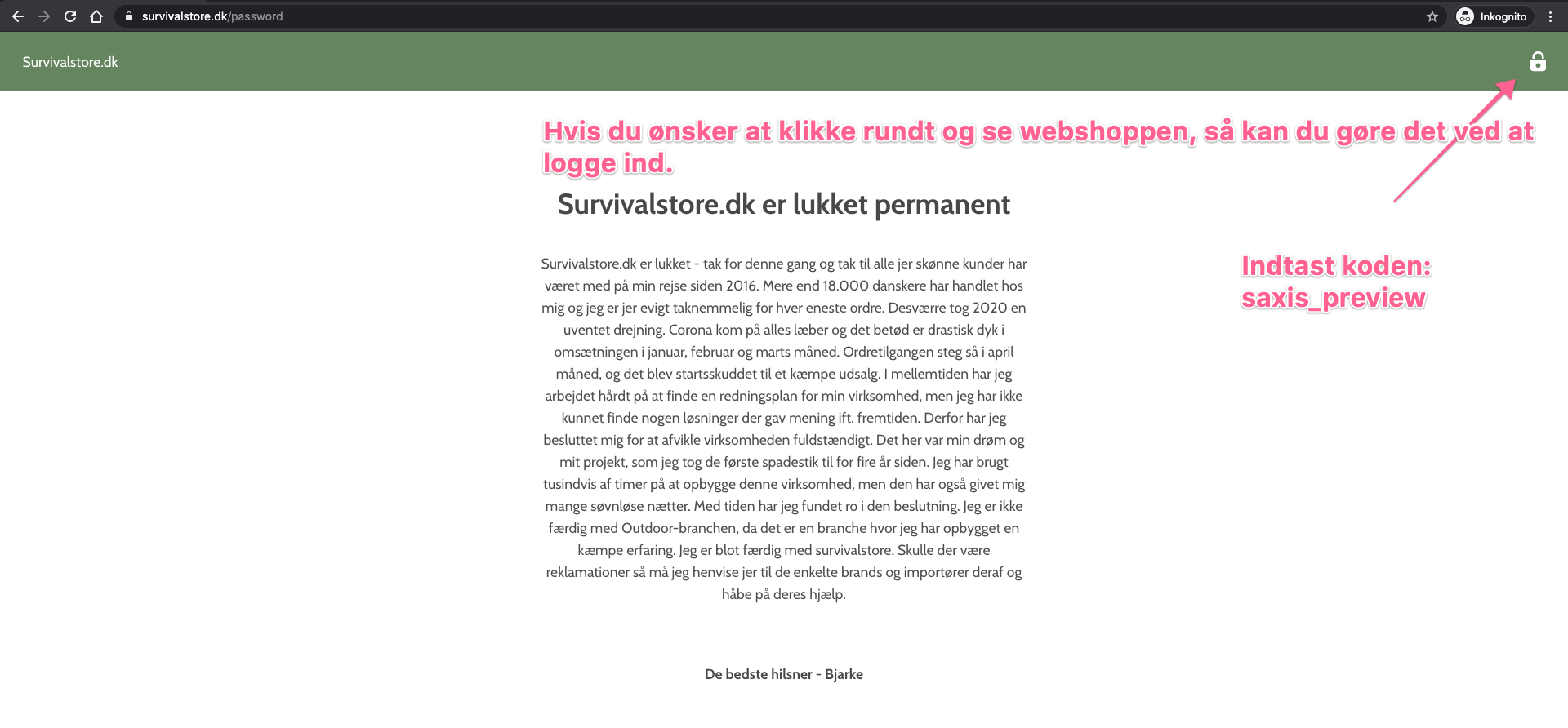 OBS: Hvis du ønsker at se webshoppen, kan du logge ind på forsiden i øverste højre hjørne, med koden: saxis_preview