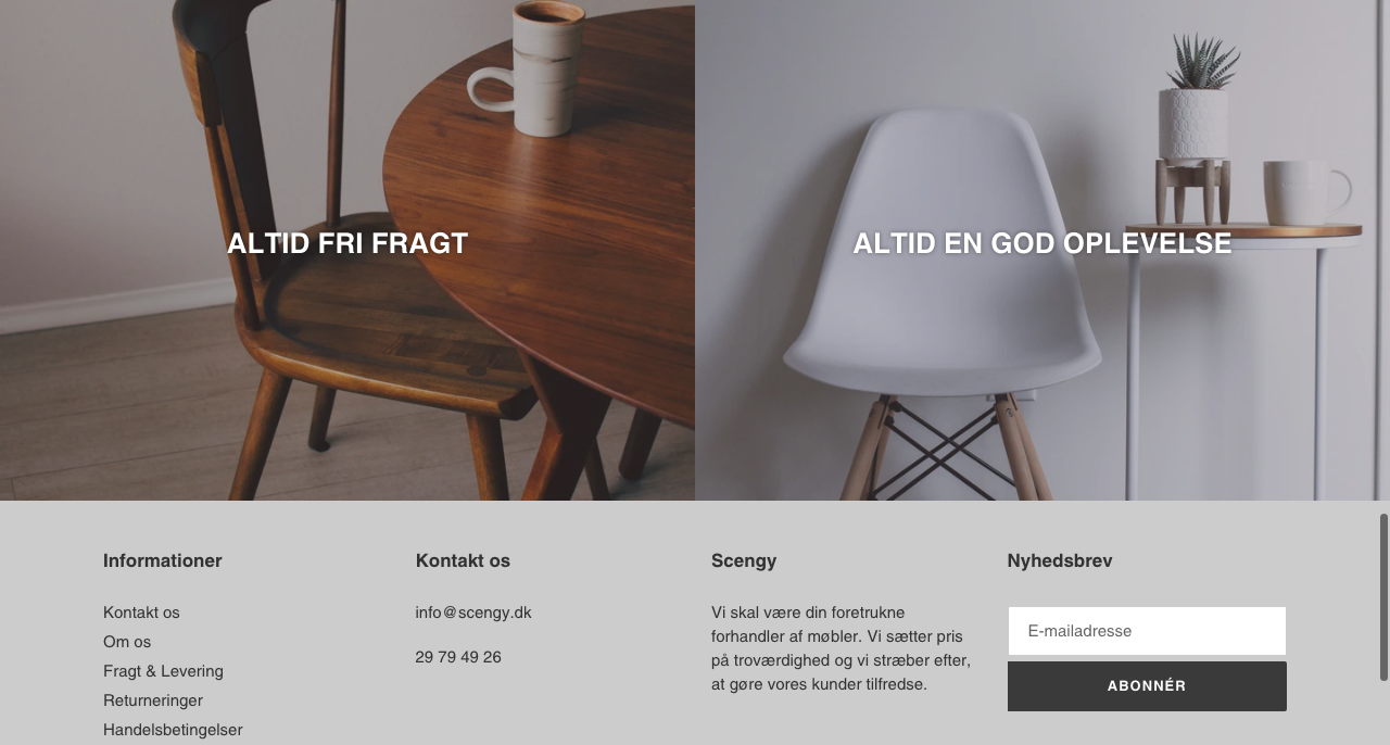 Scengy.dk er forhandler af unikke møbler. Møblerne er kvalitetsvare som alle er producerede i Danmark. Leverandøren er dansk og priserne på produkterne er i den høje ende hvilket giver en god avance. Mellem 15 - 40 % avance. Det kan dog forbedres ved at sætter priserne på produkterne op eller ved at tage kontakt til leverandør. Møblerne er af høj kvalitet og det er ikke nogen møbler som alle andre også forhandler - dette er noget som man kan skille sig ud på og dermed få opbygget et brand. Siden er samtidig lavet i Shopify hvilket er en meget begyndervenlig platform men samtidig en platform som man kan bruge som en større virksomhed.