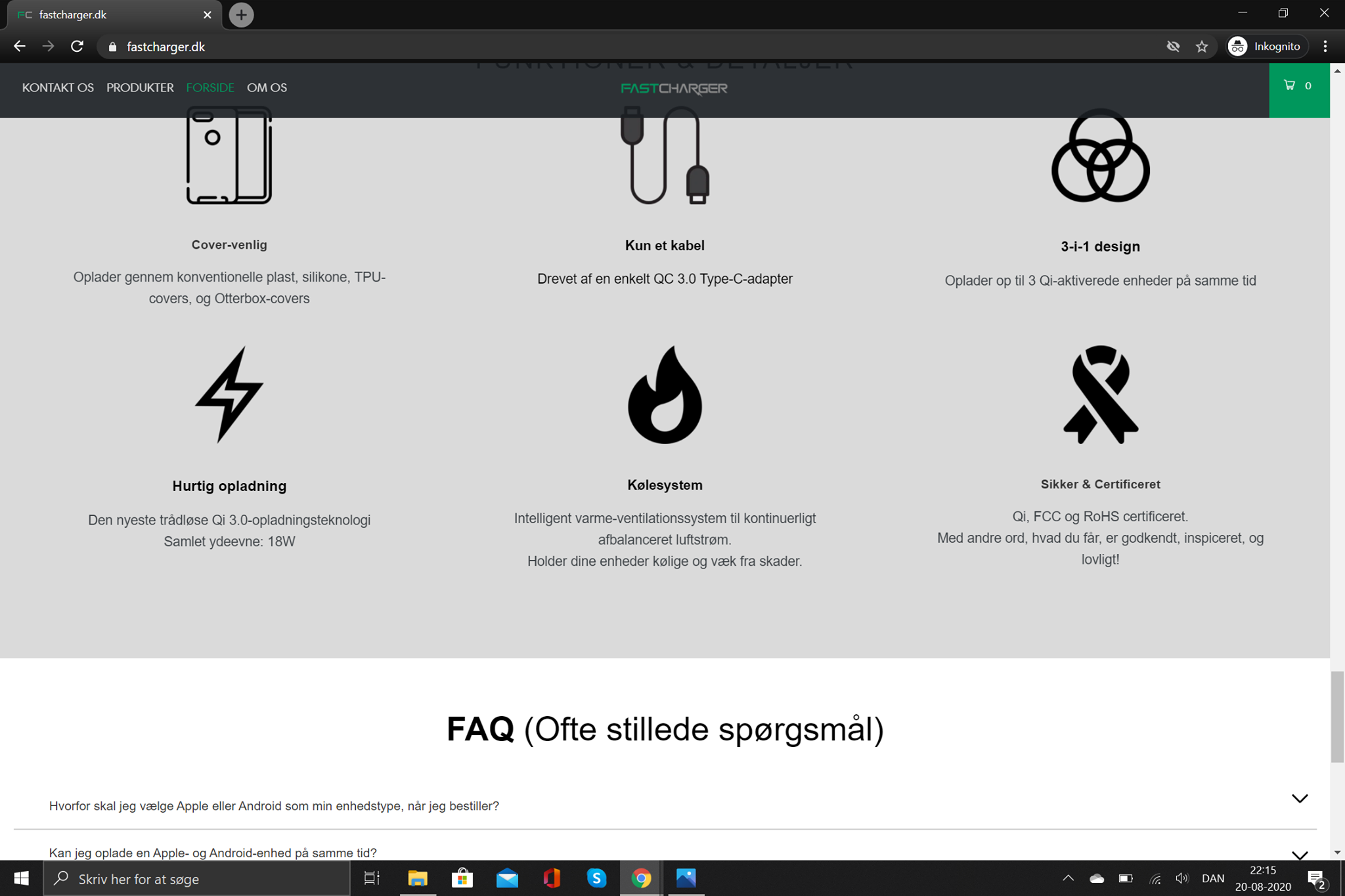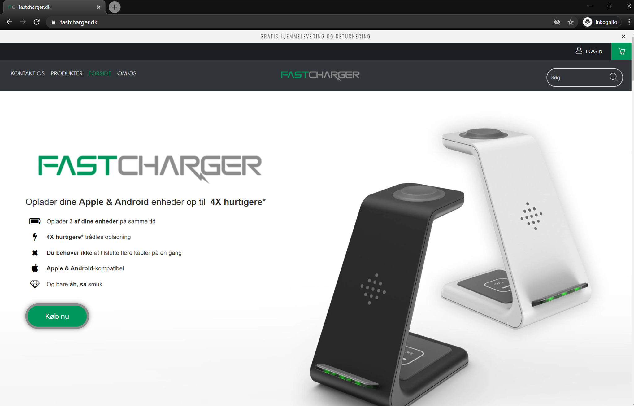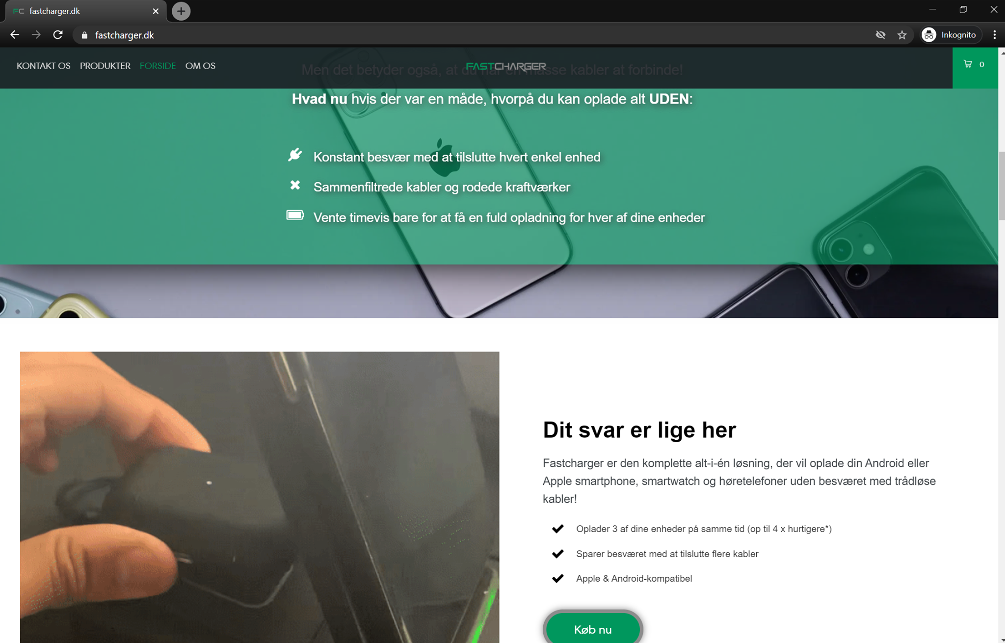 Køreklar Webshop side med salget af en unik trådløs Oplader til smartdevices