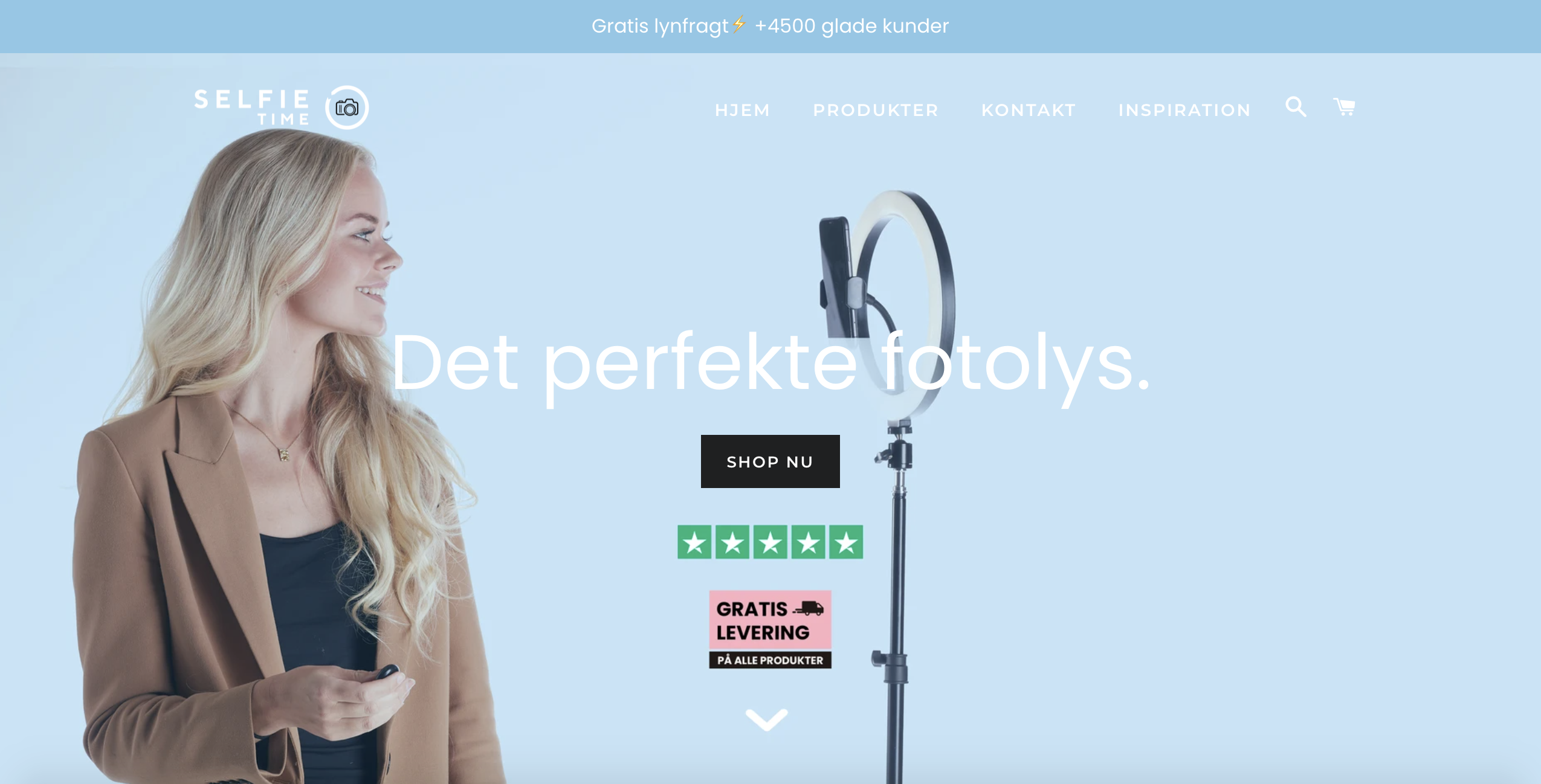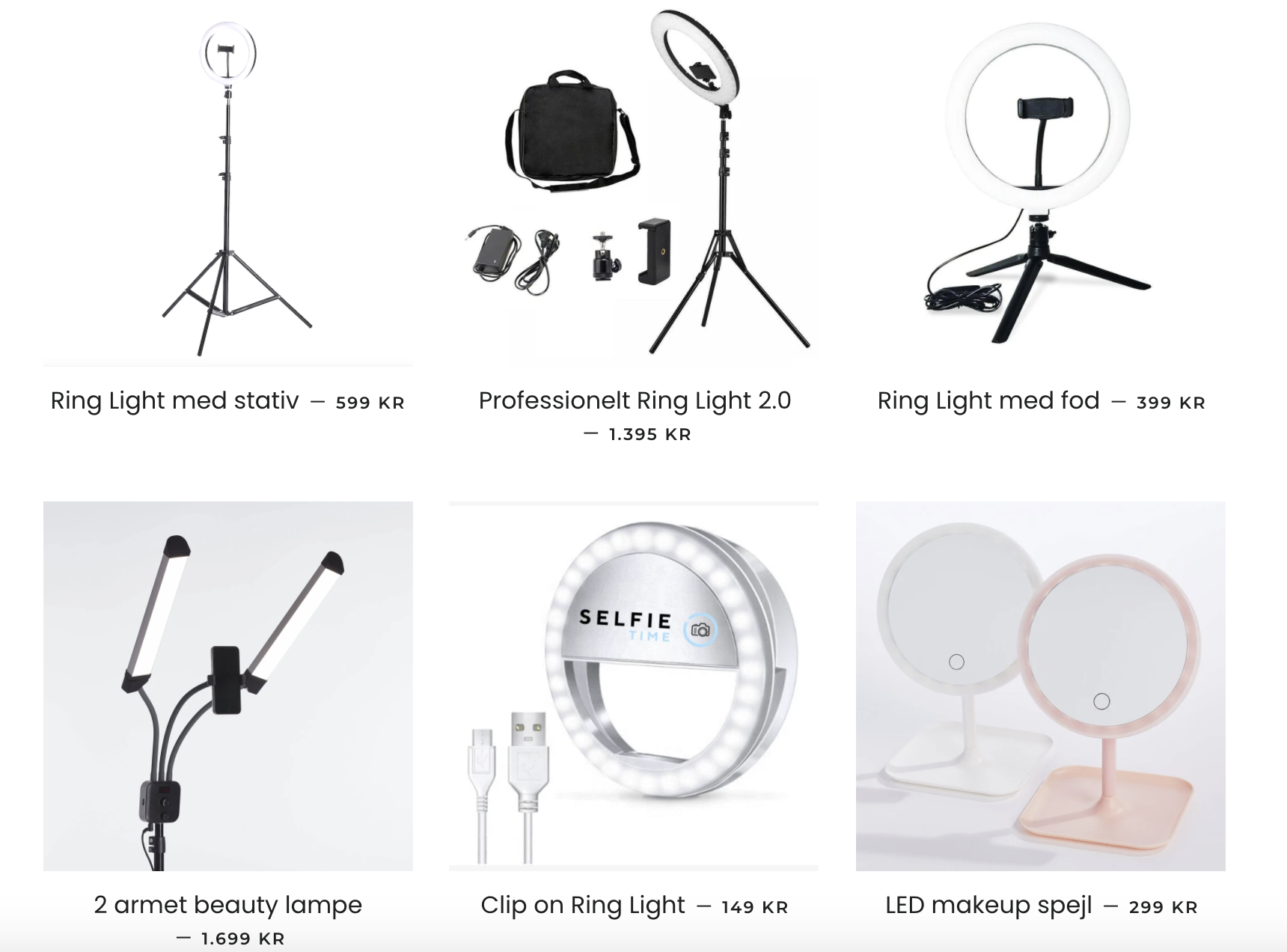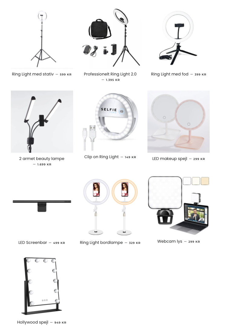 Selfietime.dk og Ring-Light.dk sælger testvindende Ring Lights, som vores kunder benytter til forskellige formål bl.a. til fotografering af sig selv, fotografering af produkter, lys til skønhedsbehandlinger, TikTok, Instagram, livestream osv. Vi har også haft 2 af Danmarks største virksomheder som B2B kunde. Billeder af produkterne er vedhæftet. Mange forretninger køber også produkterne til f.eks. tøjbutikken, frisørsalonen, tatovørklinikken mm. Flere af produkterne er vurderet bedst-i-test.