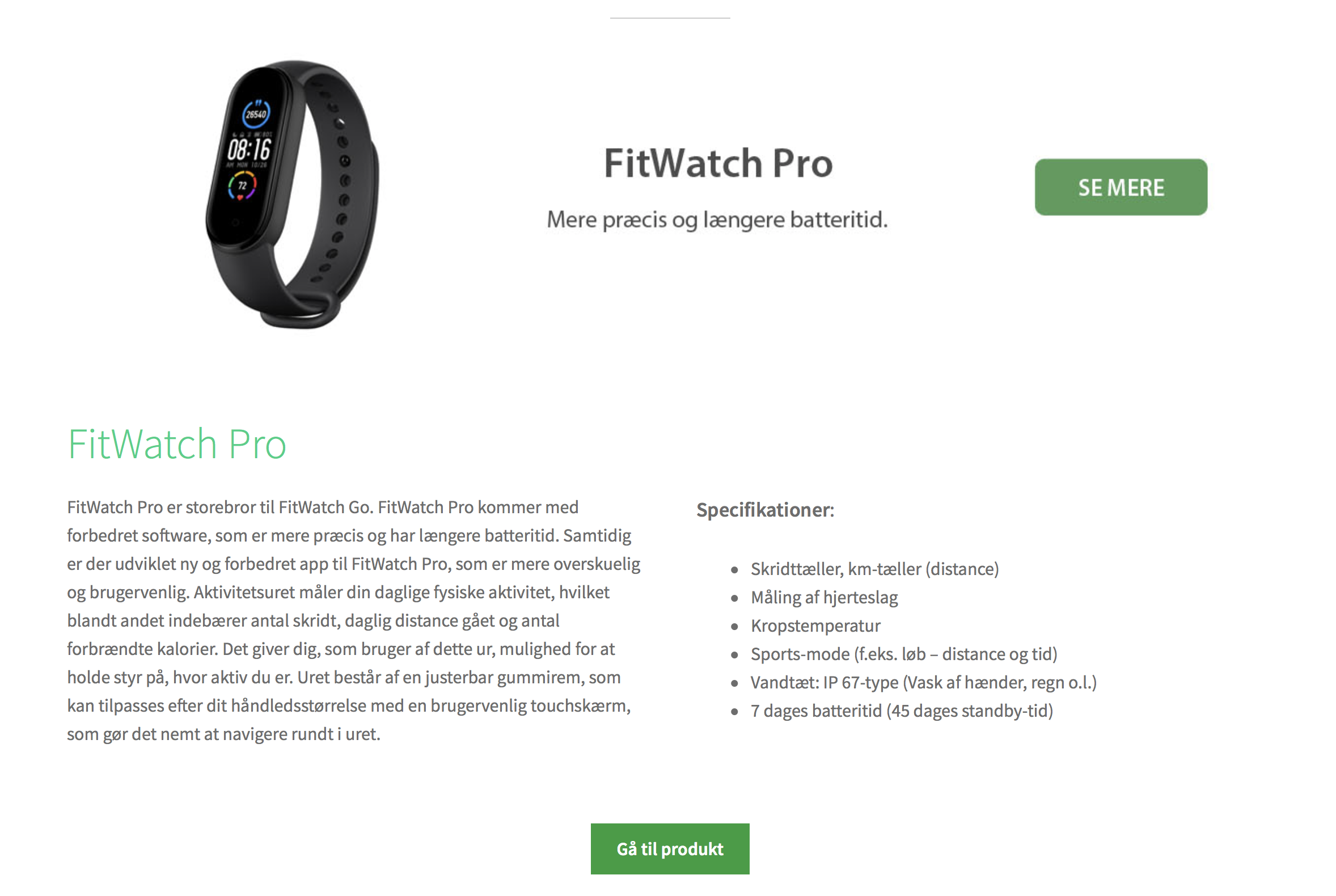 Aktivitetsurene der på nuværende tidspunkt udbydes på siden fremstår i minimalistisk og tidsløst design, hvilket skaber en bred målgruppe af potentielle købere. Produkterne giver mulighed for at måle en række forskellige ting som f.eks. antallet af hjerteslag, kropstemperatur, antal skridt gået, henlagt distance (dagligt) mm. Dertil er der sportsmode i uret, som måler distance og tid. På den måde har kunden mulighed for at holde styr på sin daglige aktivitet, hvilket giver kunden mulighed for at forbedre sit fysiske helbred.
