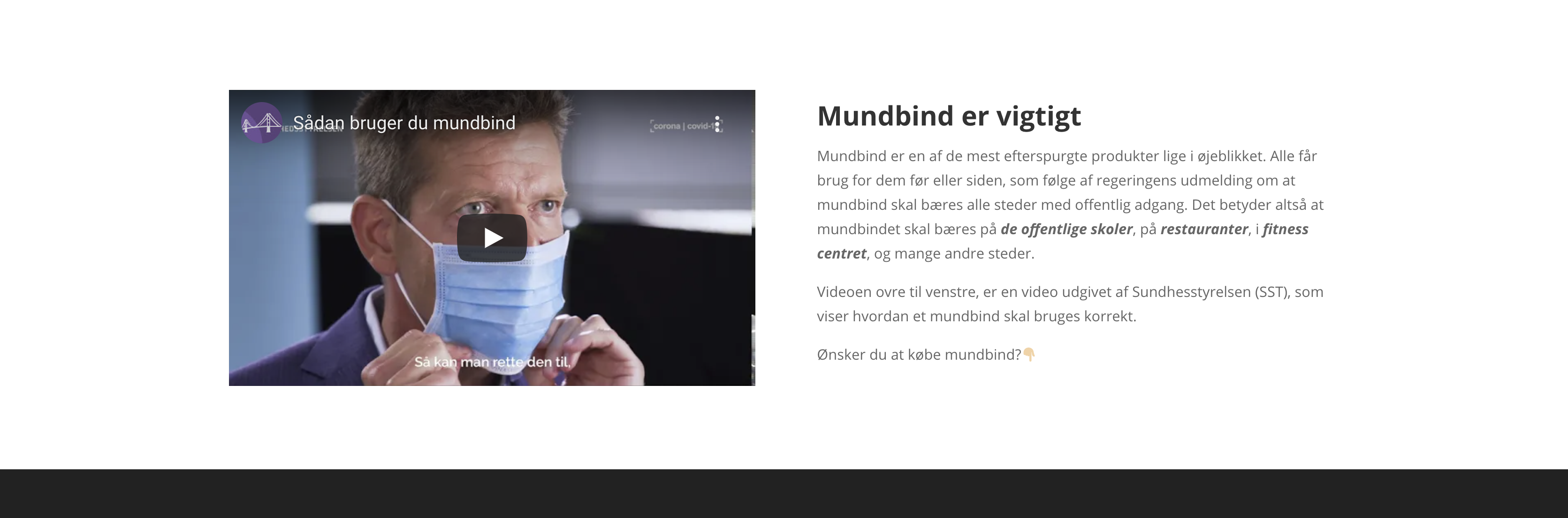 Det gav derfor mening, at lave en webshop, hvor man online sælger mundbind. Dette er en nem skalerbar webshop, med tilhørende markedsførings materiale, samt en konventeringsvenlig shop.