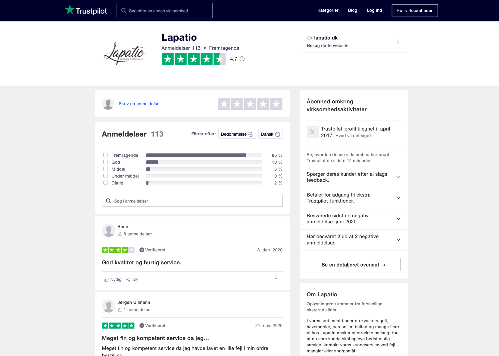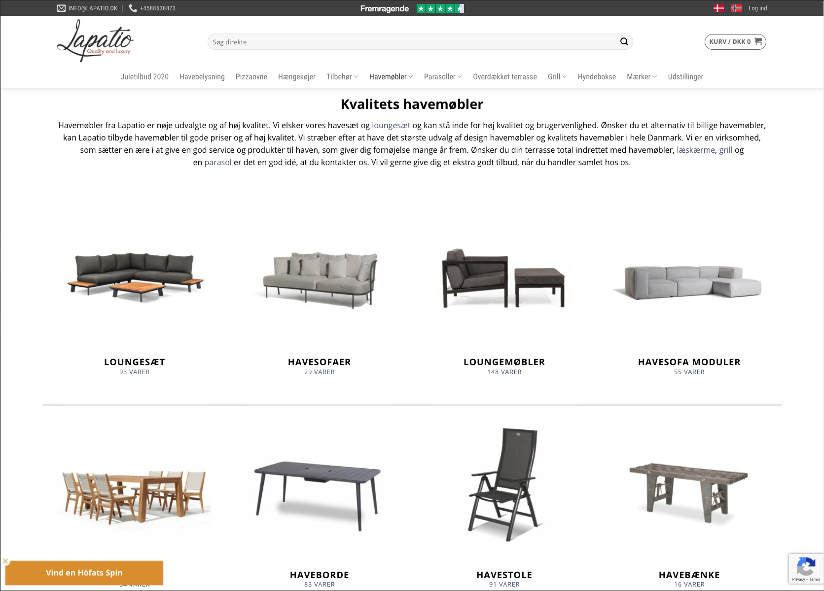 Lapatio.dk er en webshop udviklet specielt til salg af high-end kvalitets varer til udelivet. Vi har ved at fokusere på kundeservice og bæredygtig performance marketsføring været i stand til at skab en virksomhed med en høj trustcore og en formidabel vækst.