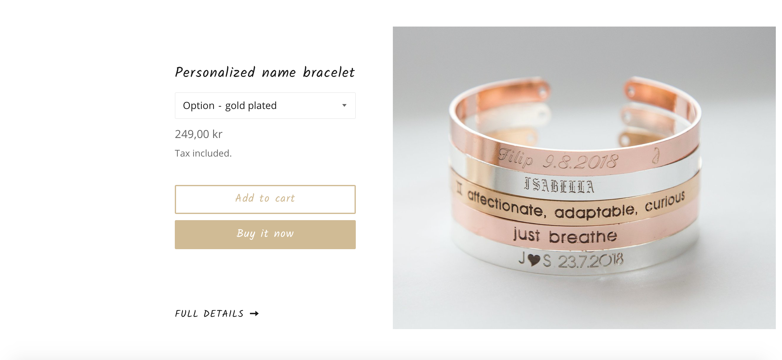 Alle produkter er lavet i kobber eller rustfrit stål og forgyldt med sølv, guld eller rosaguld. Produkterne er geniale som gaveidé til fødselsdage og jul, men også til konfirmationer, kærestegaver, mors/fars dag mm. Det gode ved denne shop er, at du ikke er bundet til at varelager, og at leverandøren står for al pakning og forsendelse, så snart kunden har lagt en ordre i din shop.