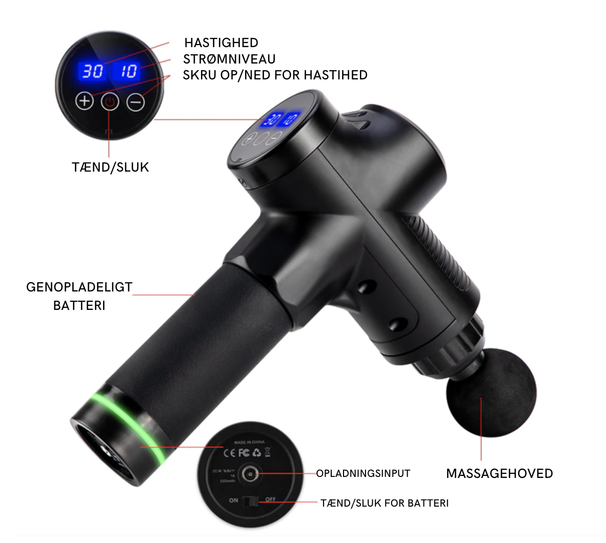 Massagepistolen er trådløs og har en meget lang batteritid. Jeg har brugt produktet on and off i omkring 2 måneder, og jeg har kun skulle oplade den 2 gange.