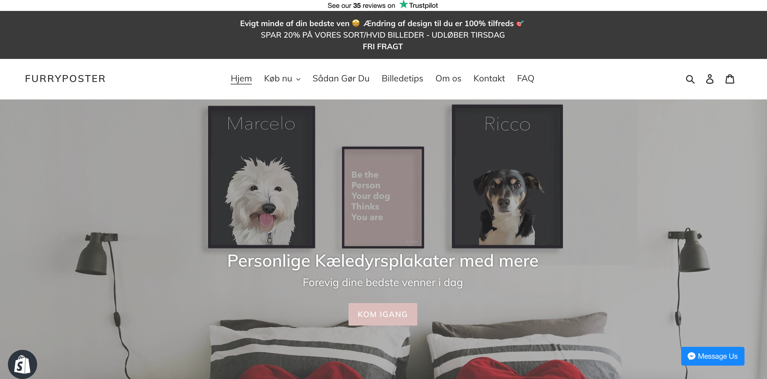Furryposter er en webshop, der laver grafiske designs af folks kæledyr, som er et meget attraktivt segment at bevæge sig. Trykkeri + design bliver varetaget af 3. parter og man kan dermed opsætte webshoppen som dropshipping, hvis man ikke selv vil pakke plakater i ramme, som jeg har kørt med indtil videre. Der er således kun dialogen med kunderne, som man selv skal tage sig af i den daglige drift, hvilket ikke fylder meget overhovedet.