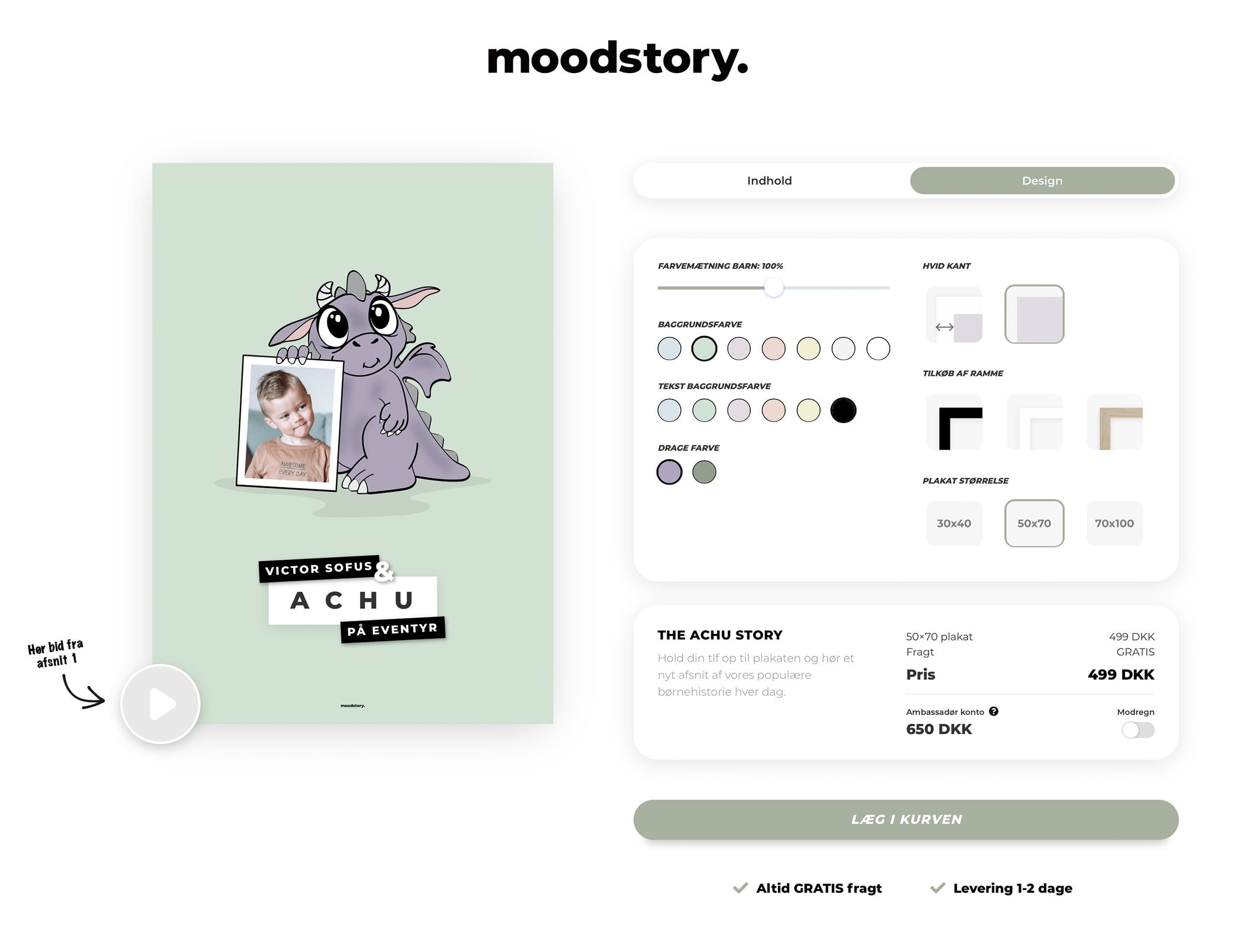 Kunden designer selv Achu plakaten ved at indsætter billede og navn af sit barn, som gør det til en super personlig plakat, hvor barnet ser Achu som en god ven. Kunden kan selv style plakaten, så den passer ind i indretningen med de farver man måtte ønske.