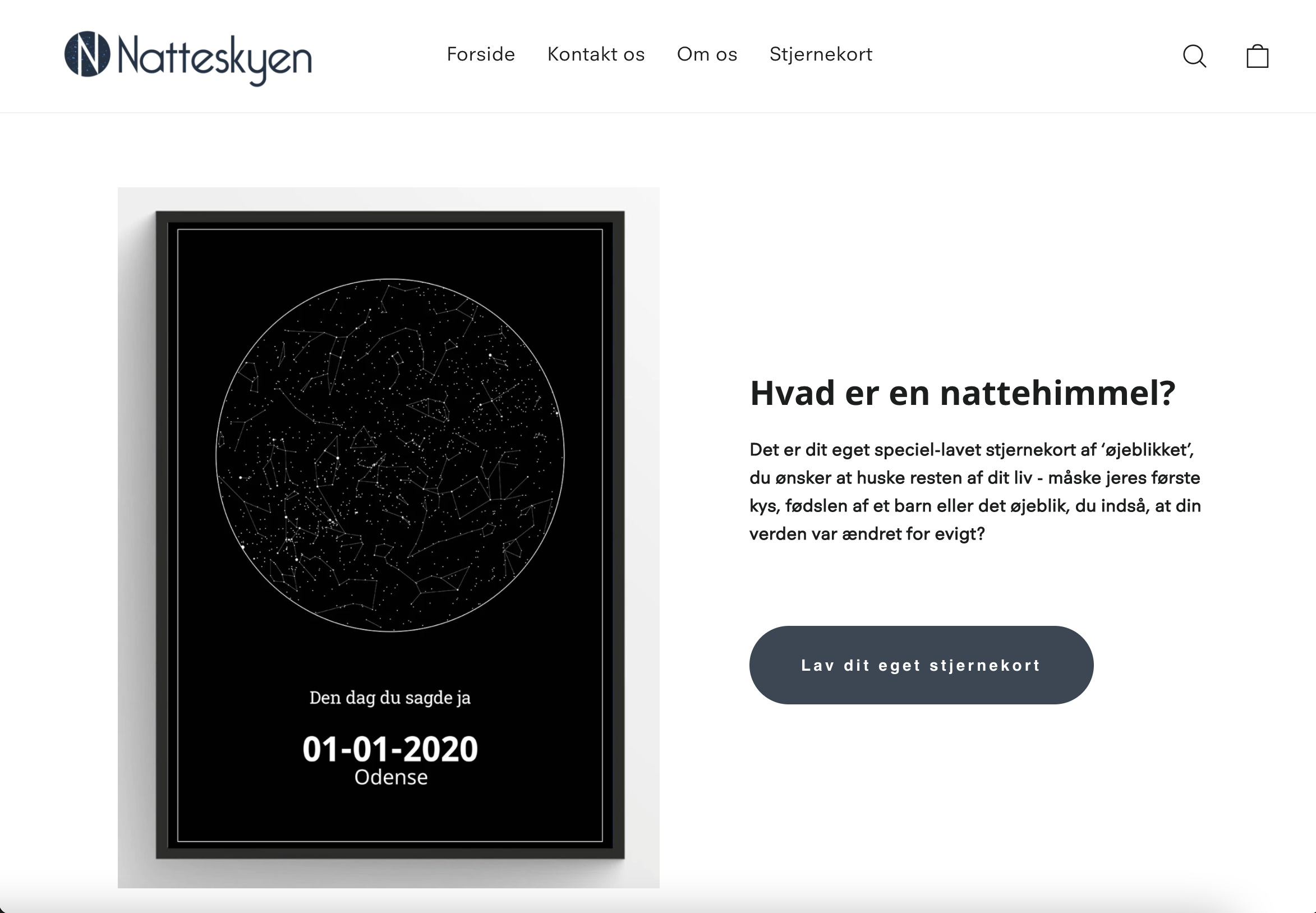 Køreklar shop med salg at custom natteskys plakater. Perfekt til gave eller som minde. Der kæmpe stort potientale på det danske markedet, hvor du har et unikt produkt som ingen andre, du har en høj margin, og det er en dansk leverandør som står for afsendelse af plakaterne. Alt er automatiseret, det eneste du kommer til at stå for er at få salg. Siden er bygget custom, og bygget således du selv ville kunne ændrer alt, og der vil være mulighed for tilføjelser løbende af andre typer plakater osv.