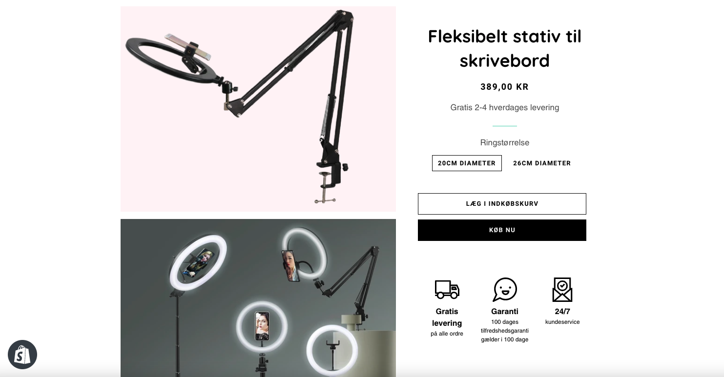 Produktet der sælges i webshoppen, er de populære ring lys, der bliver brugt til at give god belysning til billeder eller videoopkald. Jeg har selv købt produktet hjem fra leverandøren, for at teste om kvalitet og funktionalitet lever op til forventningerne, og det gør det bestemt. Siden jeg har fået det, har jeg altid haft det tændt under online møder, da det giver et helt andet udtryk. Produktet er nemt at samle og virker helt som det skal.