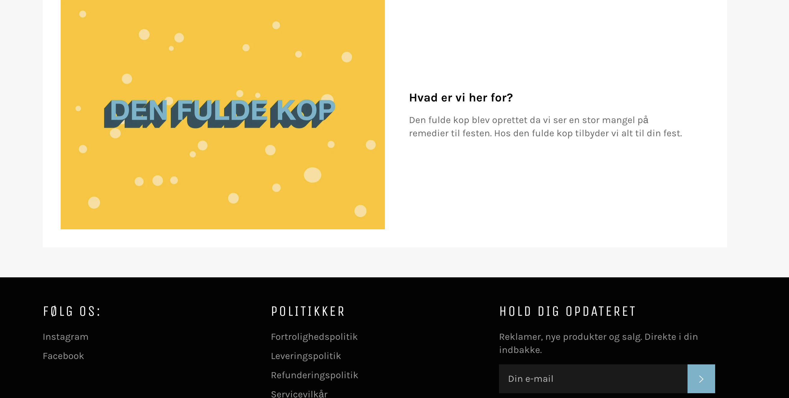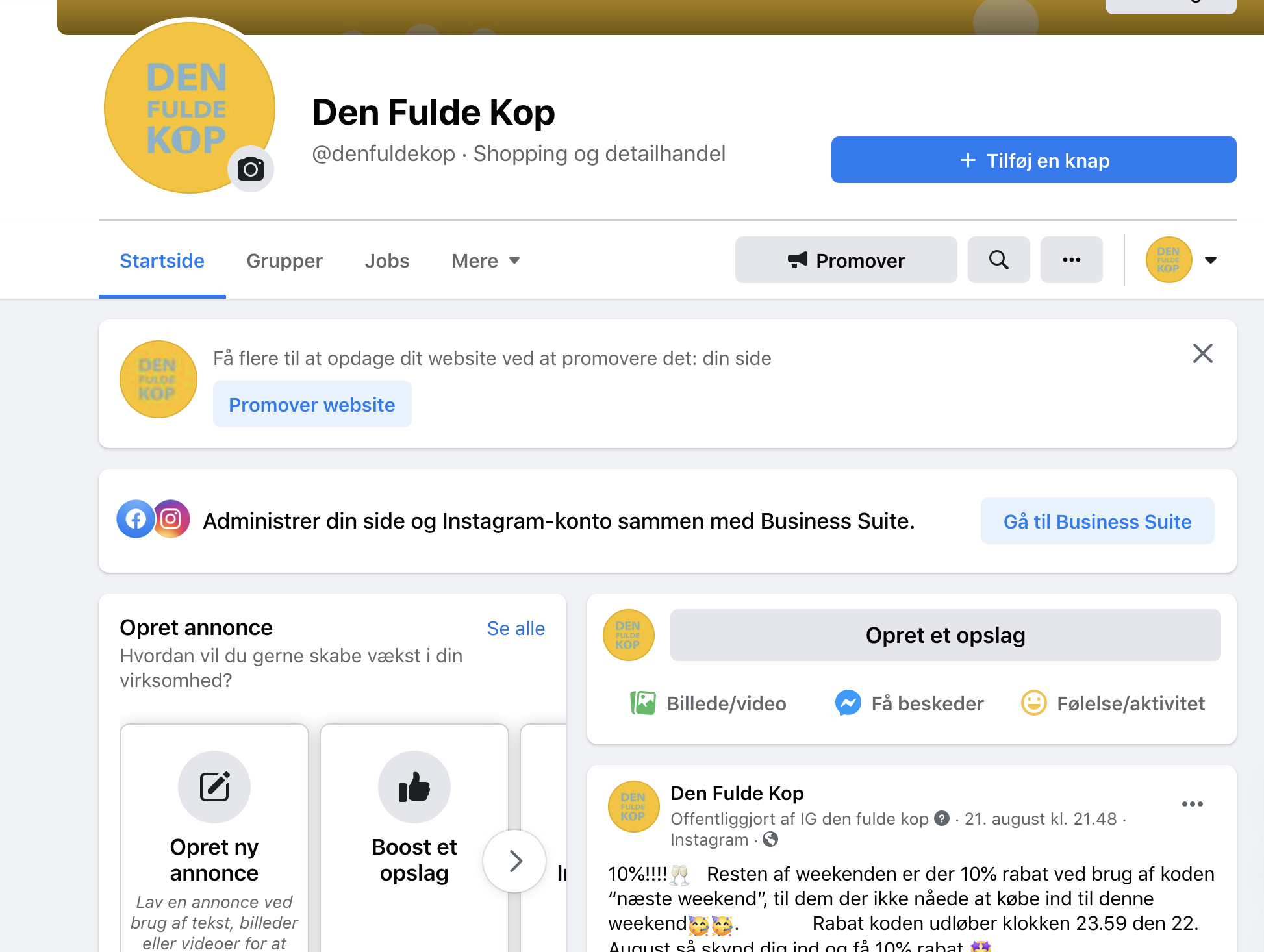 Virksomheden den fulde kop er startet af 3 unge drenge med en drøm om iværksætteri, dog har vi haft ulykken med os at vi har fået for travlt til at drive virksomheden. Virksomheden står som sig selv klar til at køre, der vil være mulighed for at få skabeloner af os til at igangsætte annoncering. Den fulde kop har hen over de seneste par måneder haft en stabik omsætning, men grundet manglenede tid har der været slukket for annoncerne over FB business og der har kun blev gjordt brug af vores social medier til at markedsføre. Hvis du er den rette person til at bære faklen videre og føre denne fantastiske virksomhed op til sit potientiale, så kontakt os på denne profil.