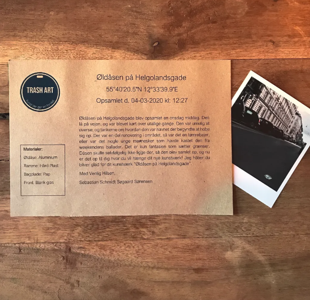 Et par uger efter fandt han en genbrugt ramme, tilføjede koordinator, dato for opsamling og lokation. Værket blev solgt få dage efter til en værdi af 1.500DKK. Fornemmelsen af at have gjort verden til et renere sted og gjort andre glade fik ham til at sætte endnu mere gang i Trash Art.