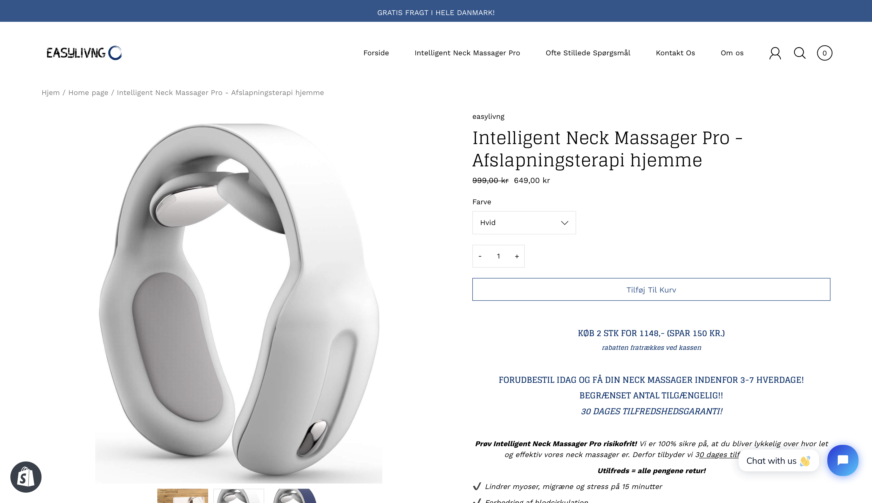 Kvalitets nakke massager med 3 forskellige indstillinger og 15 niveauer samt varmefunktion. Lille, let og transportabel. Let at bruge. Nakke massagen erstatter dyre terapeutbesøg med behagelig massage i sit eget hjem. Produktet er relevant fordi ekstremt mange sidder foroverbøjet over sin tlf. eller computer idag, hvilket fører til nakkeproblemer, som kan løses med produktet. Dermed er målgruppen også bred.