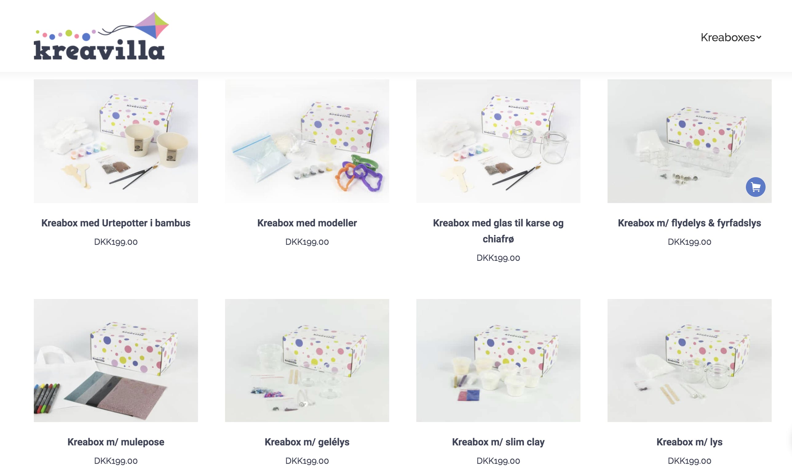 Kreavilla er en webshop som sælger kreakasser til børn. Hver kasse indeholder et projekt som lige er til at gå til med alle ingredienser og vejledning.