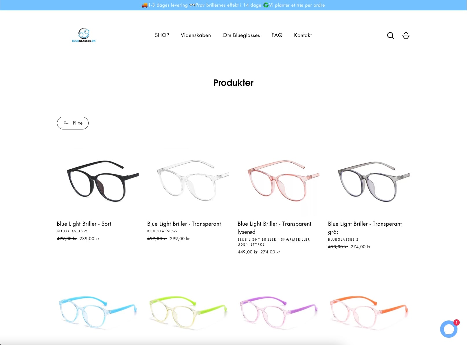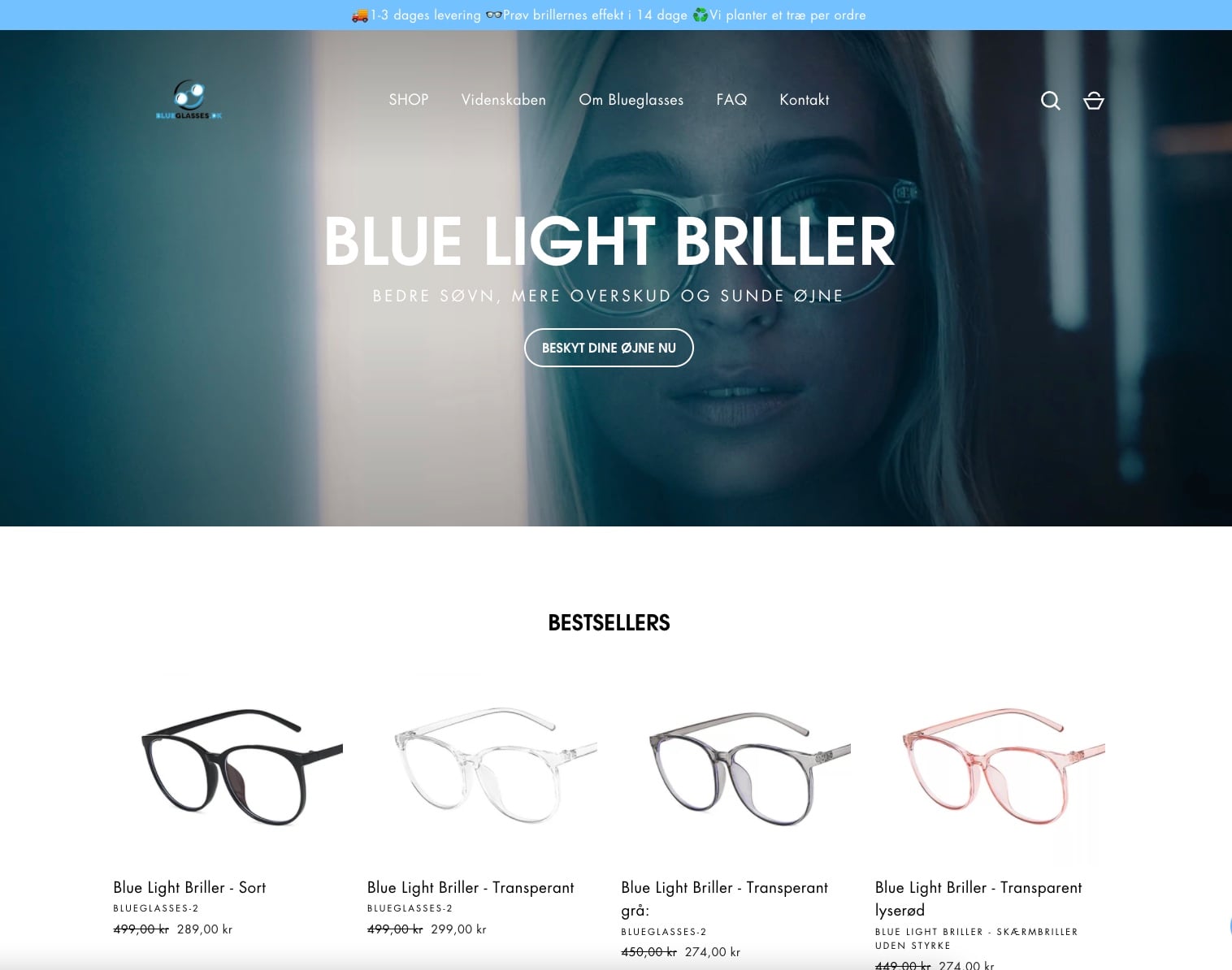 Vores produkt består i 4 forskellige varianter af Blue Light Briller og 7 forskellige til børn, hvor vores transperant er den bedst sælgende. Brillerne blokerer for det skadelige blå lys som vi konstant bliver udsat for. De er særligt relevante at bruge om aftenen et par timer inden sengetid eller, hvis man tilbringer længere tid foran skærmen. Brillerne forbedrer søvn, reducerer hovedpiner og tørre/trætte øjne foran skærmen.