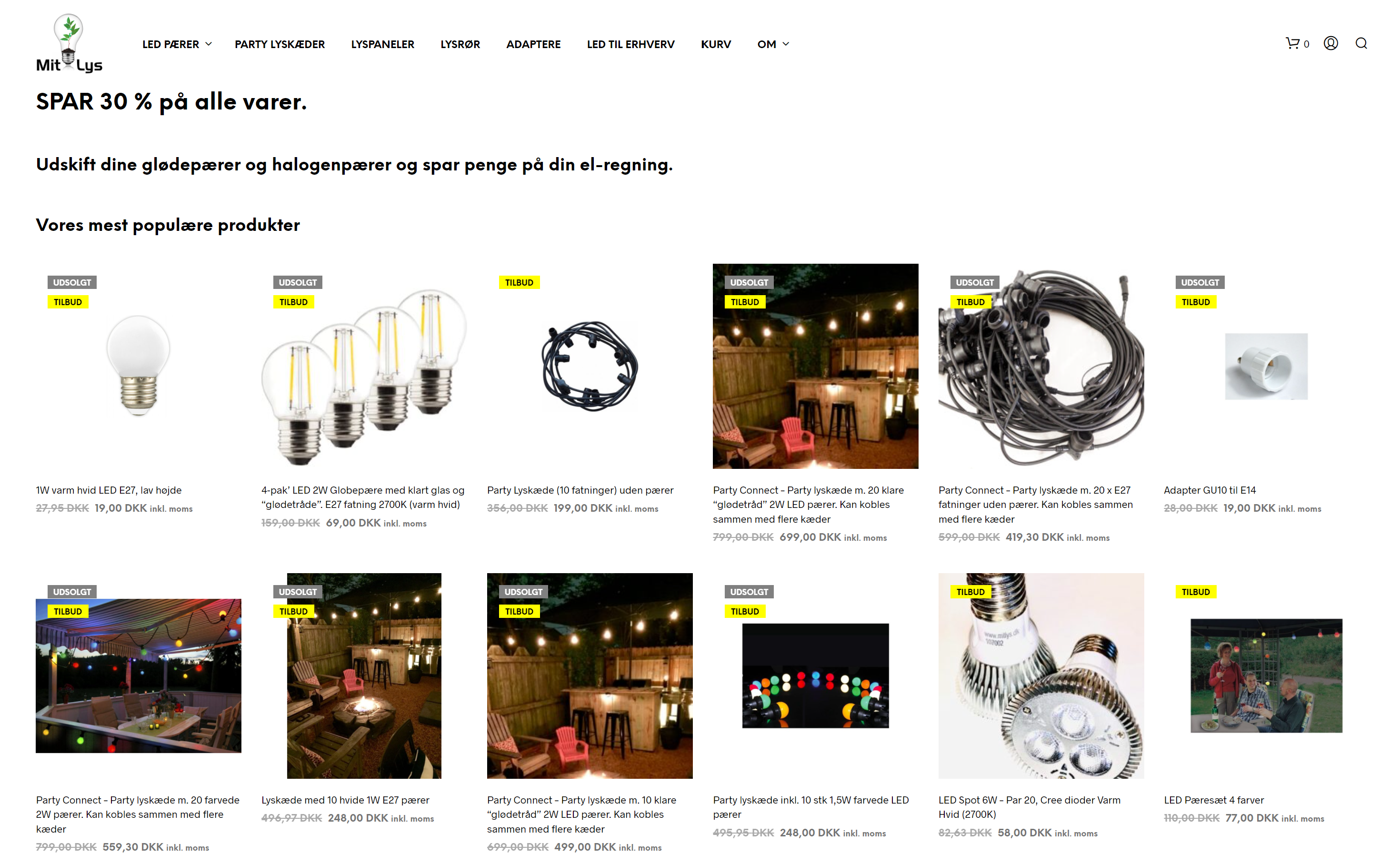 Mitlysshop.dk henvender sig til forbrugere med salg af led-pærer, glødepærer, lyspaneler og party lyskæder. Party lyskæderne til haven har været det klart mest populære produkt de seneste par år, og vi ranker nr. 1 med søgeord relateret til lyskæder. Mitlysshop.dk har en domæneranking på 3 og url-rating på 16 med 33 refererende domæner.