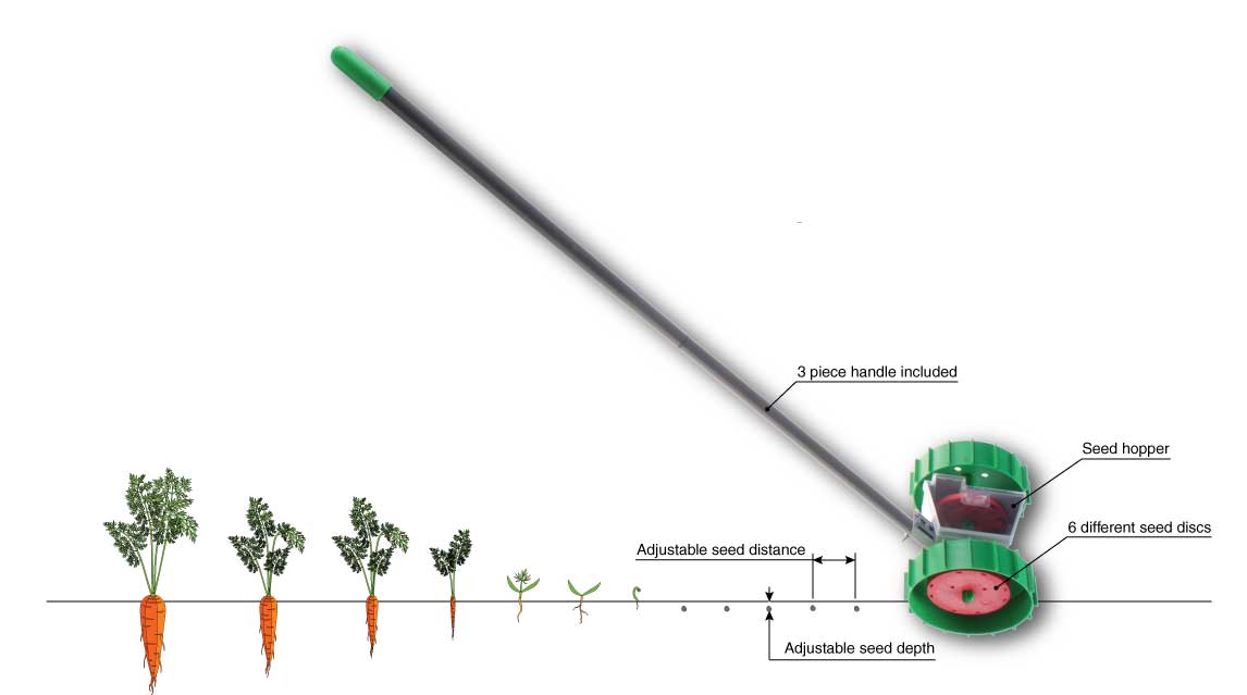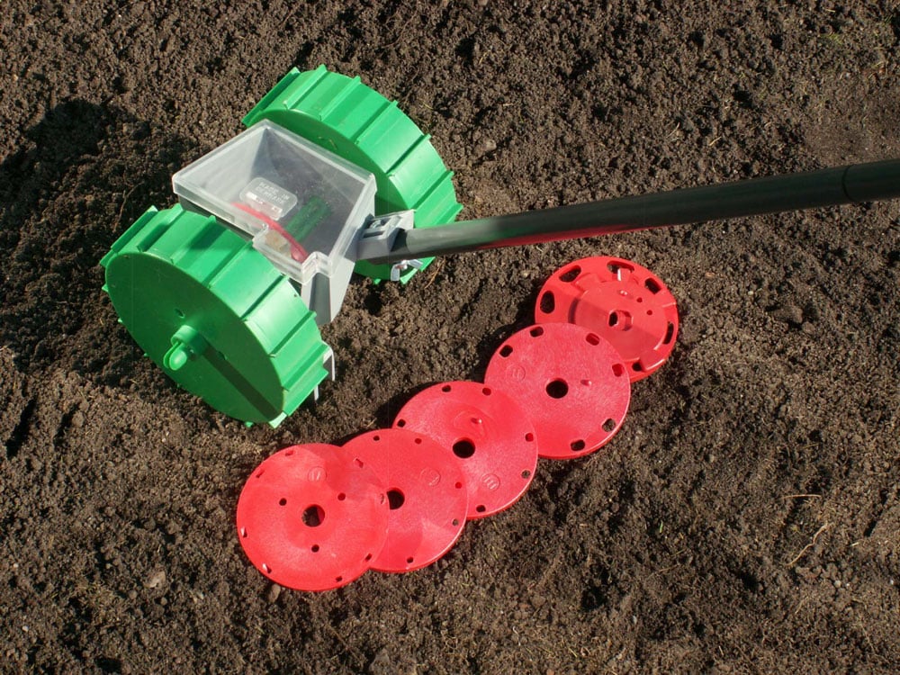 Saalet Easy Sower laver fugen, sår frøene og dækker fugen i en arbejdsgang.
