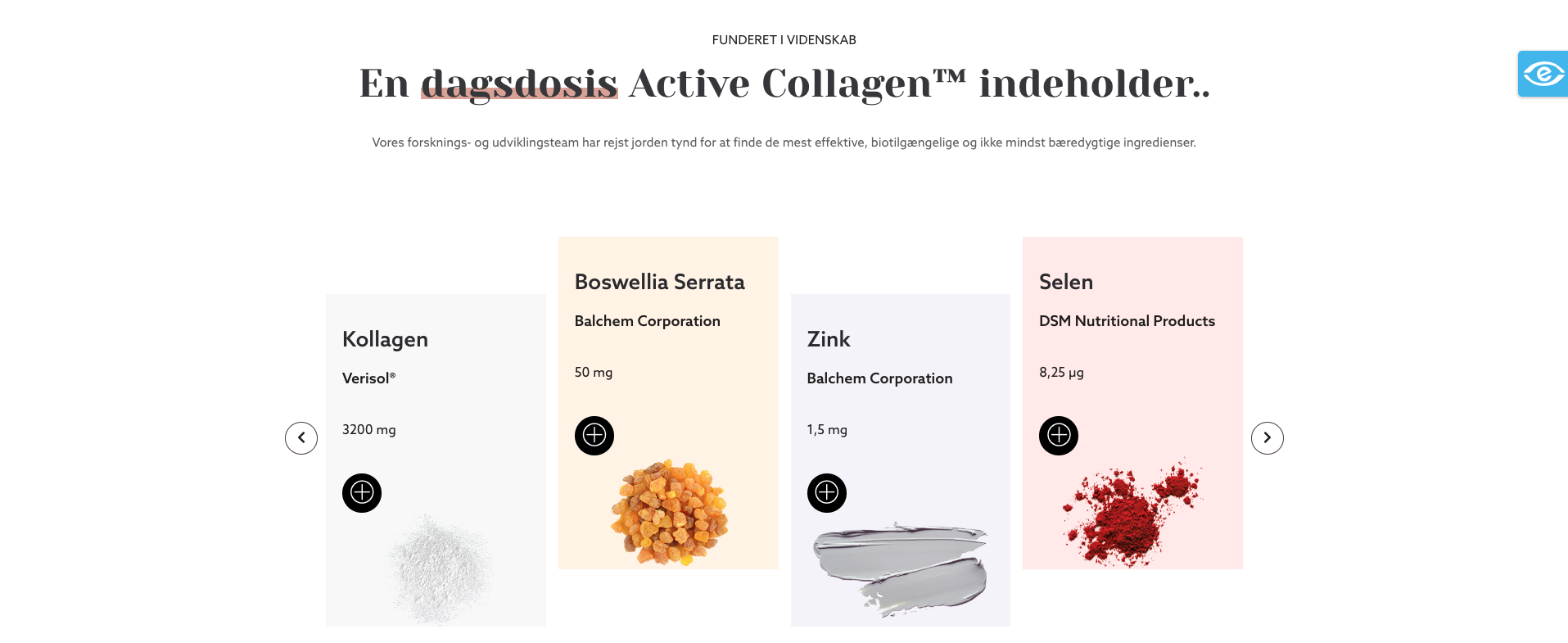 Her tilbyder vi et blend af kollagen- og vitaminer på abonnement, opdelt i daglige doser, leveret lige til døren, hver 30 dag, for kun 299 kr.