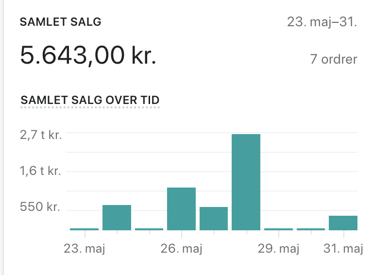 Shoppen omsatte for 5600,- de første 7 dage ved brug af FB & IG ads - det vil sige der er allerede proof of concept for at det er muligt at drive shoppen videre med stor succes.