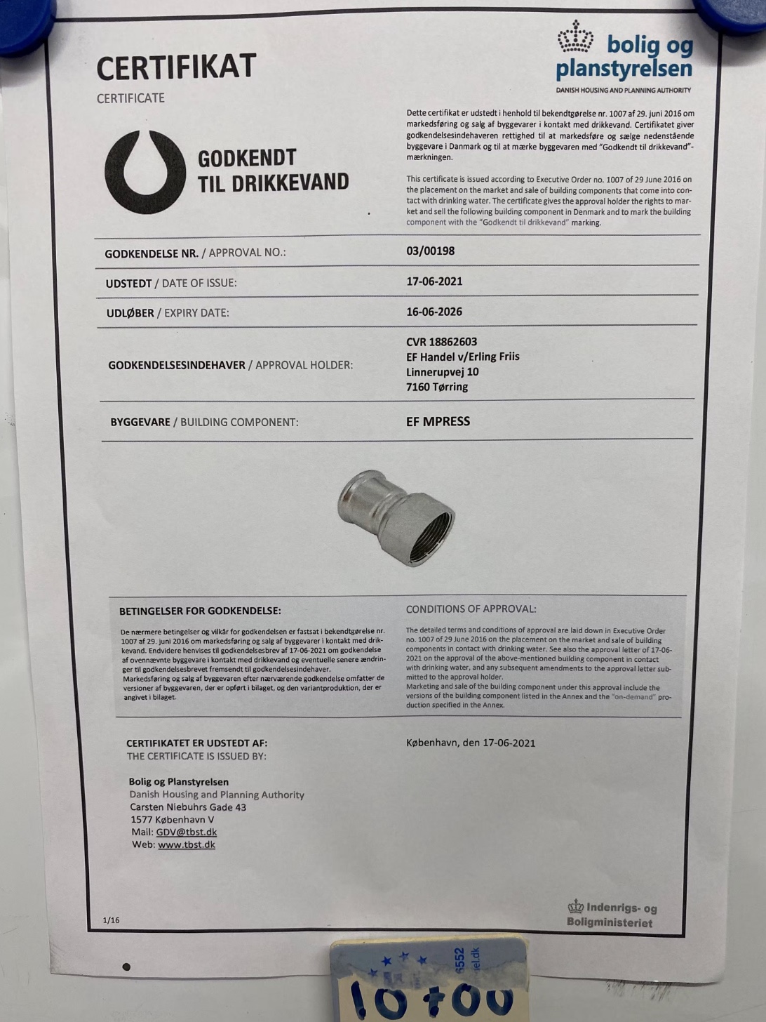 Domænet : Pressfittings.dk kan også medfølge, derudover så ligger der dokumenter på GDV godkendelsen med fabriks kontrol via Dansk Teknologisk institut.