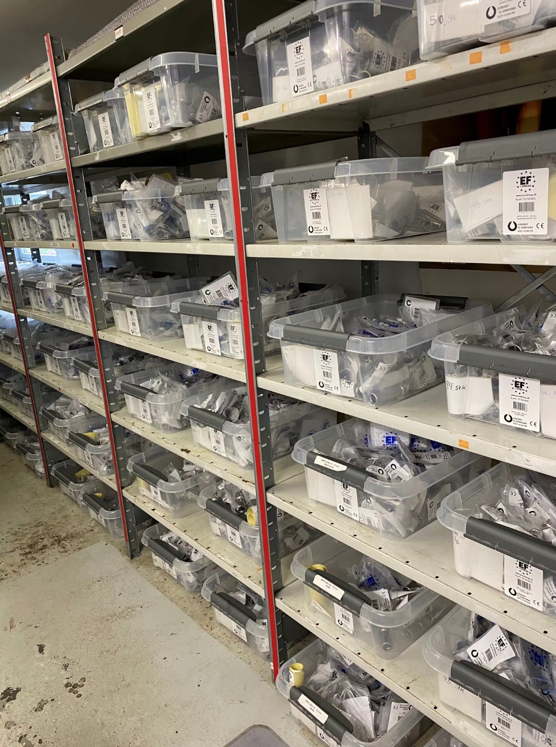 Varelager består af div M Press fittings i 4 dimensioner 15-18-22 og 28 mm alt i ASIS 316L som er GDV godkendt, dertil er der ca 1000 meter rør i 6 meters længder af 15-18 og 28mm ialt ca 12500 enheder.
