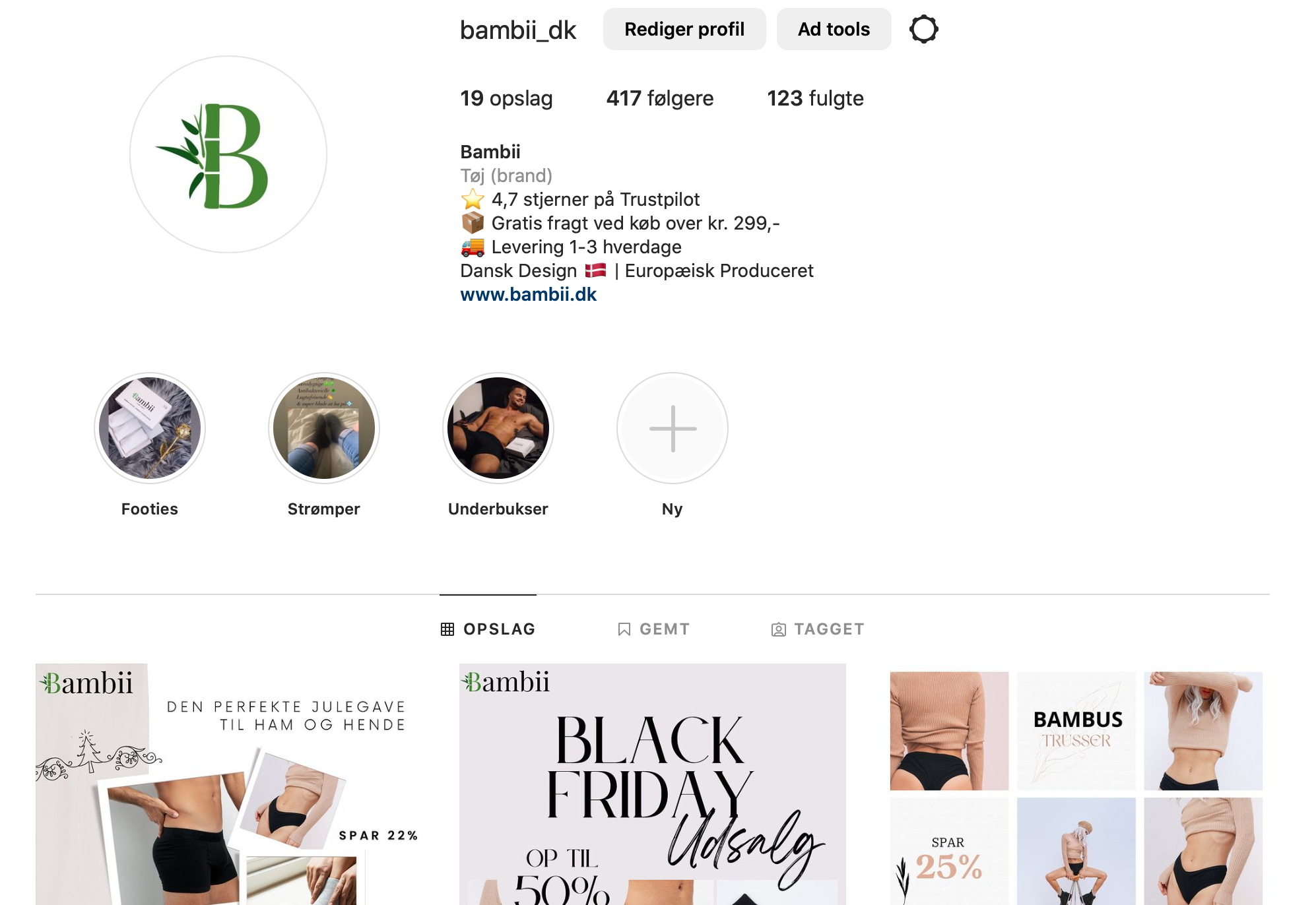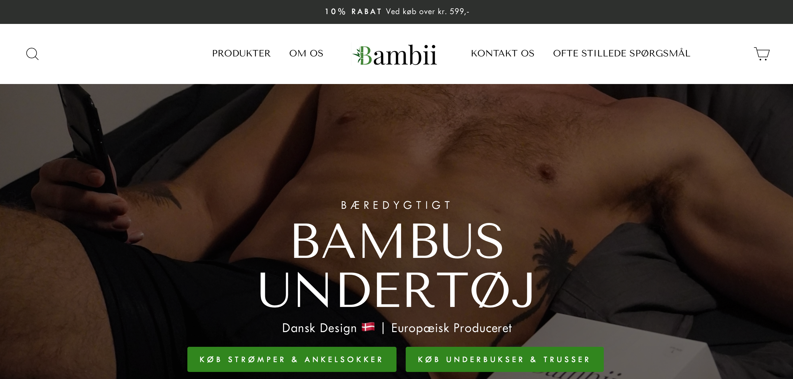 Bambii.dk er et dansk brand med professionel webshop der sælger undertøj i bambus i et eksplosivt voksende marked. Produkterne er yderst bæredygtige og består af ankelsokker, strømper, underbukser og trusser. Der sælges altså både til mænd og kvinder - samt findes der mange muligheder for udvidelse af varesortiment (alt fra t-shirts til håndklæder og dyner). De nuværende produkter er testet gennem mange år fra fabrikant, og er således nok de bedste på markedet.