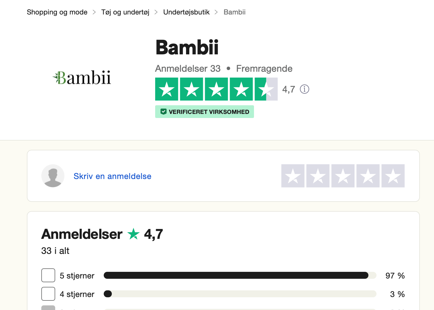 Bambii.dk har en trustpilot med 4,7 i rating fordelt på anmeldelser.