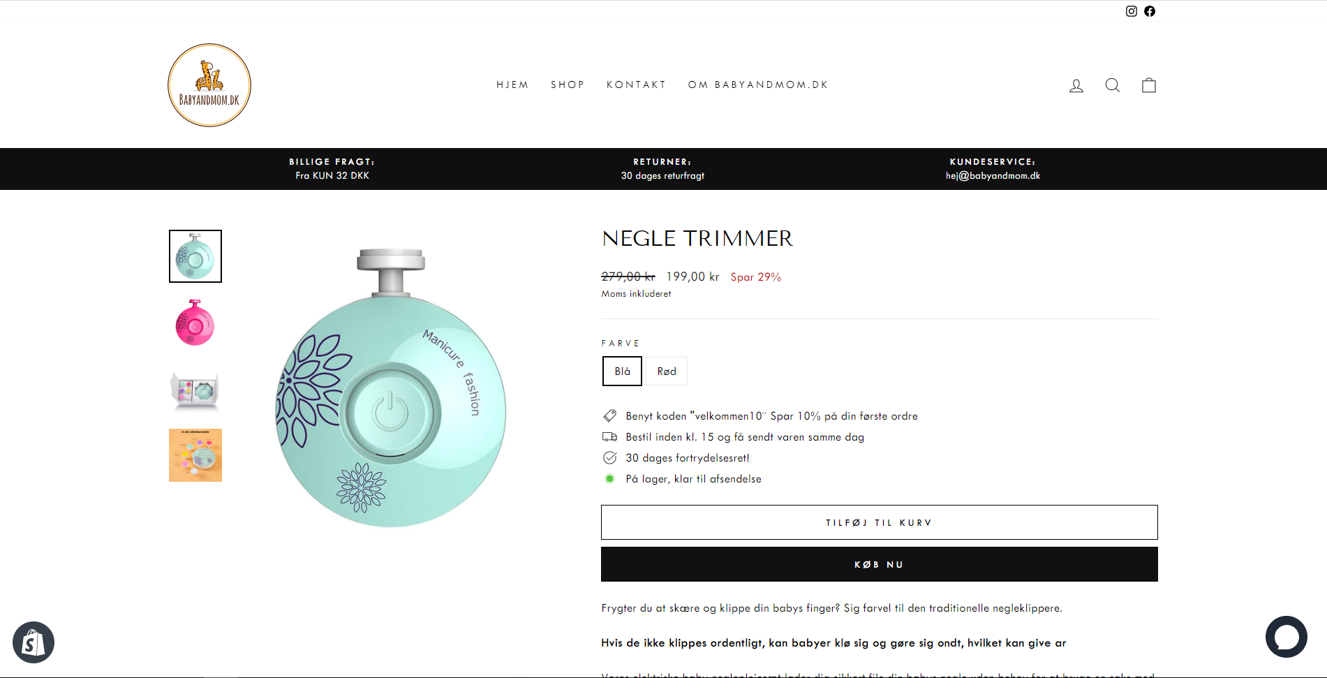 Vi sælger et produkt som vi har fået stor succes med, og produktet er elektronisk negletrimmer til baby/børn som forældre har man frygt for klippe baby negle med den traditionelle negleklipper men kommer til klippe forkert eller lave skarpe kanter når barnet kløer sig som kan medføre til et grimt ar.